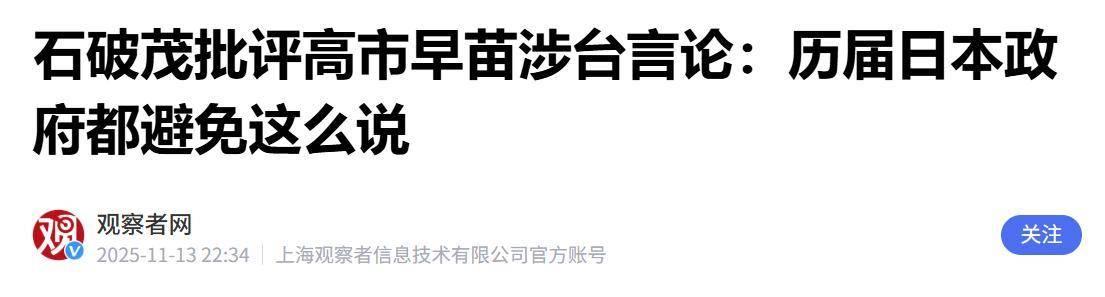 11月24日,据日本媒体报道,针对日本首相高市早苗涉台错误言论在国内外持续发酵,对日本外交、经济造成副面影响。 11月23日,日本前首相石破茂再一次批评高市首相称,在涉及外交问题上,不能过一的嘴瘾。 石破茂讲,中日关系非常“微妙”,希望高市内阁能注意到这一兰,“你说完自己想说的过了一时嘴隐,但牵涉到外交问题上,你不能这么做,在发言时只想自己的支持率"。 评论,从高市涉台挑衅、错误言论之后,这是石破茂第2次批评日本首相了。 面对国内外一片谴责声,石破茂在告诫早市悬崖勒马,早点结束外交风波。[呲牙][呲牙][呲牙][呲牙][呲牙][呲牙]