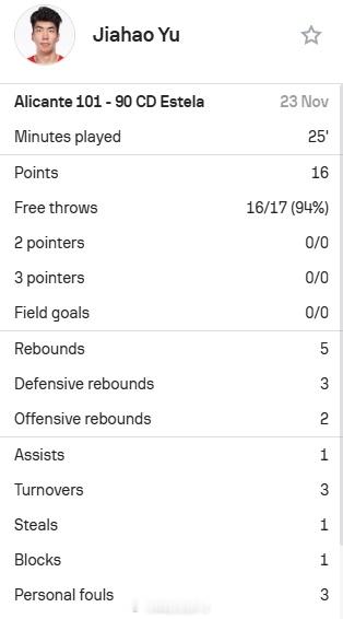 17罚16中!余嘉豪西乙生涯之夜 25分钟无运动战进球16分 两项新高 11月23日讯 在今晚结束的西乙第九轮比赛中,余嘉豪效力的埃斯特拉90-101不敌阿利坎特。余嘉豪本场比赛迎来西乙生涯之夜,他出战25分钟2投0中,但17罚16中(1次技术犯规罚球),得到16分5篮板1助攻1抢断1盖帽,出场时间和得分均创新高。