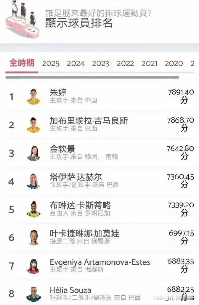 世界著名排球网站对现役世界女排球员实力做了一项评比,参考标准为得分能力,个人获得世界大赛奖项,以及对球队所做贡献为基础,中国球员朱婷以7891.40分排名世界第一,比较遗憾的是这个排名前30名除了朱婷之外再没有中国女排球员 。 目前31岁的朱婷依然是中国女排实力最强的主攻,目前国内能达到朱婷高度的球员还没有,小将吴梦洁有这样的潜质,最后成就能不能达到朱婷的高度,尚不得而知。 陈忠和曾经说过,朱婷是百年一遇的排球天才,以前中国女排拿冠军的时候好像感觉不到,现在朱婷离开了,才感觉到朱婷的伟大。