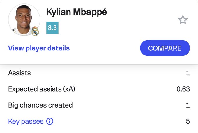 Sofascore数据统计,姆巴佩代表巴黎与皇马在联赛单场送出至少5次关键传球的场次如下: