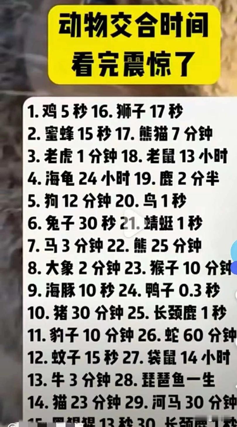 昨晚看动物世界,动物的繁衍时间,看完整个人都不好了,我竟然还不如一个动物! 大概看了下,鸡差不多6秒,老虎一分钟,狮子十七秒! 长的有猪猪30分钟,老鼠十三个小时! 猫二十多分钟,狗十二分钟! 河马三十分钟! 突然发现为什么每次家里的猫狗看我的表情都是浓浓的鄙视和不屑了! 是真的瞧不起这个人[捂脸][狗头] 估计在它们心里,主人除了会铲屎,其他就是废柴,跑步跑不过它们,其他也不行[笑哭][笑哭]