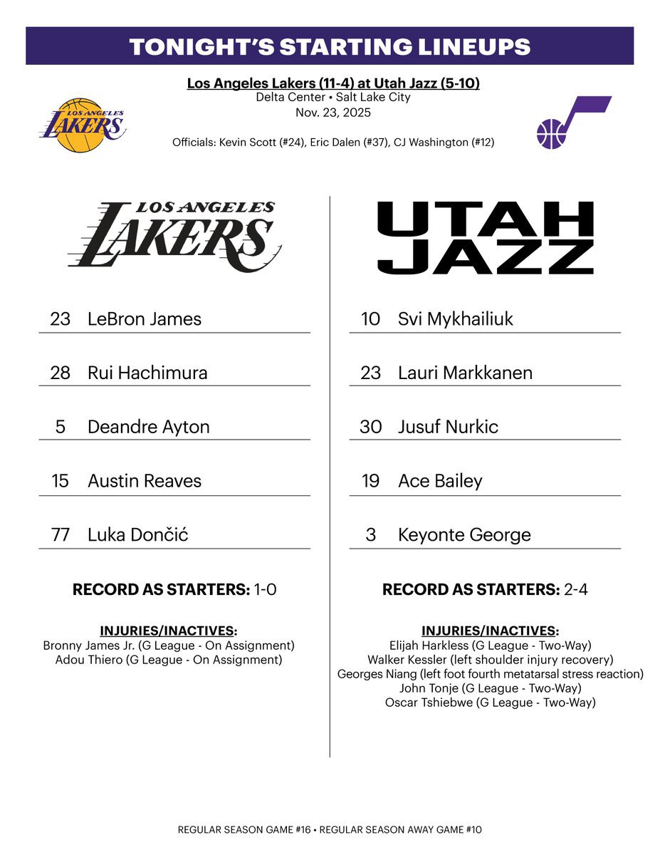 自媒体湖人国度报道。湖人队对阵爵士队的首发阵容名单公布。