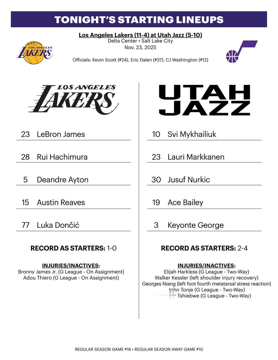 记者RyanWard报道。今晚洛杉矶湖人队对阵犹他爵士队的NBA常规赛首发阵容已确定。