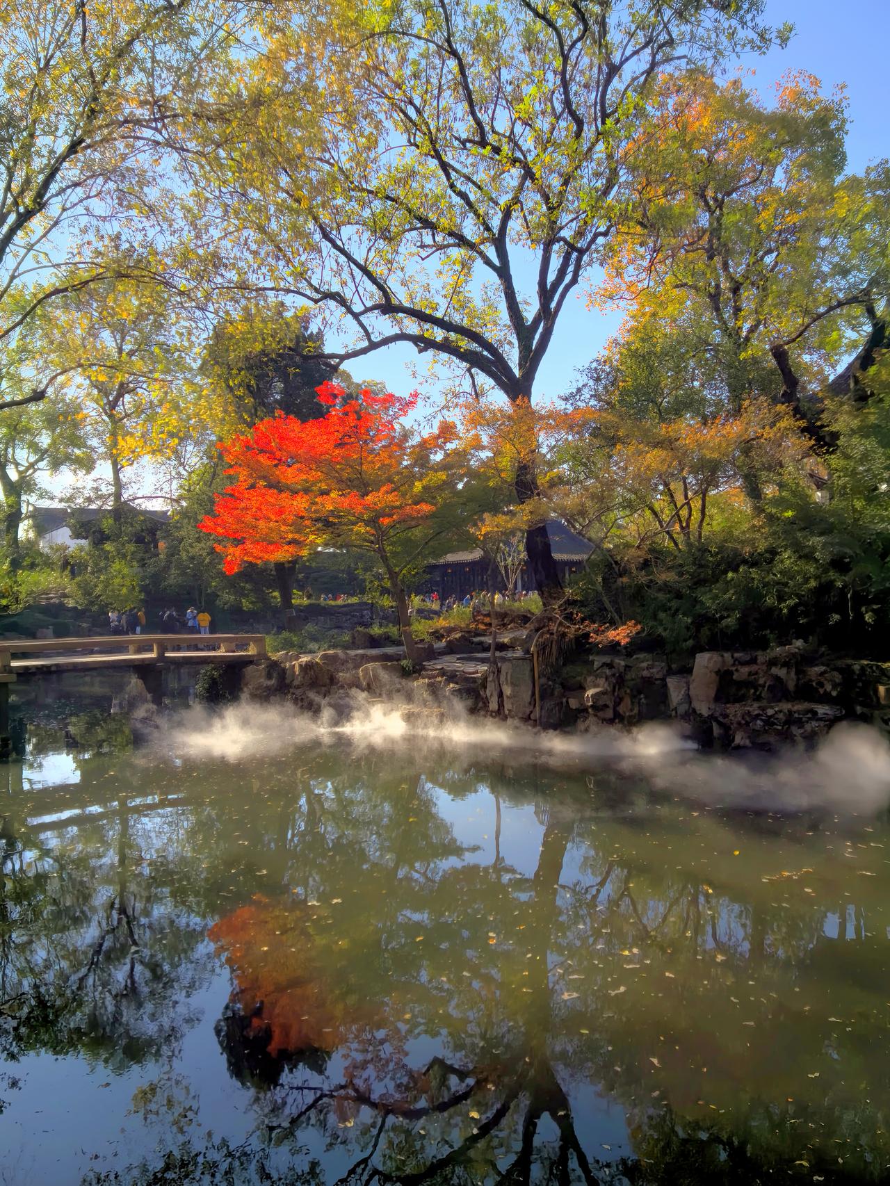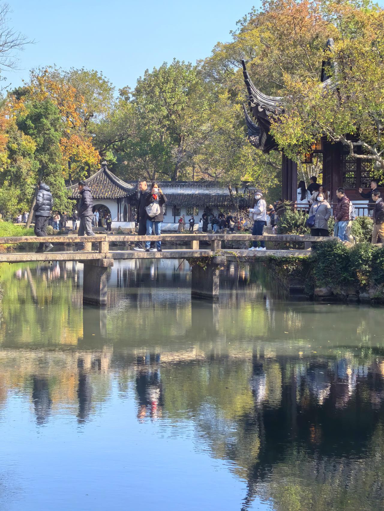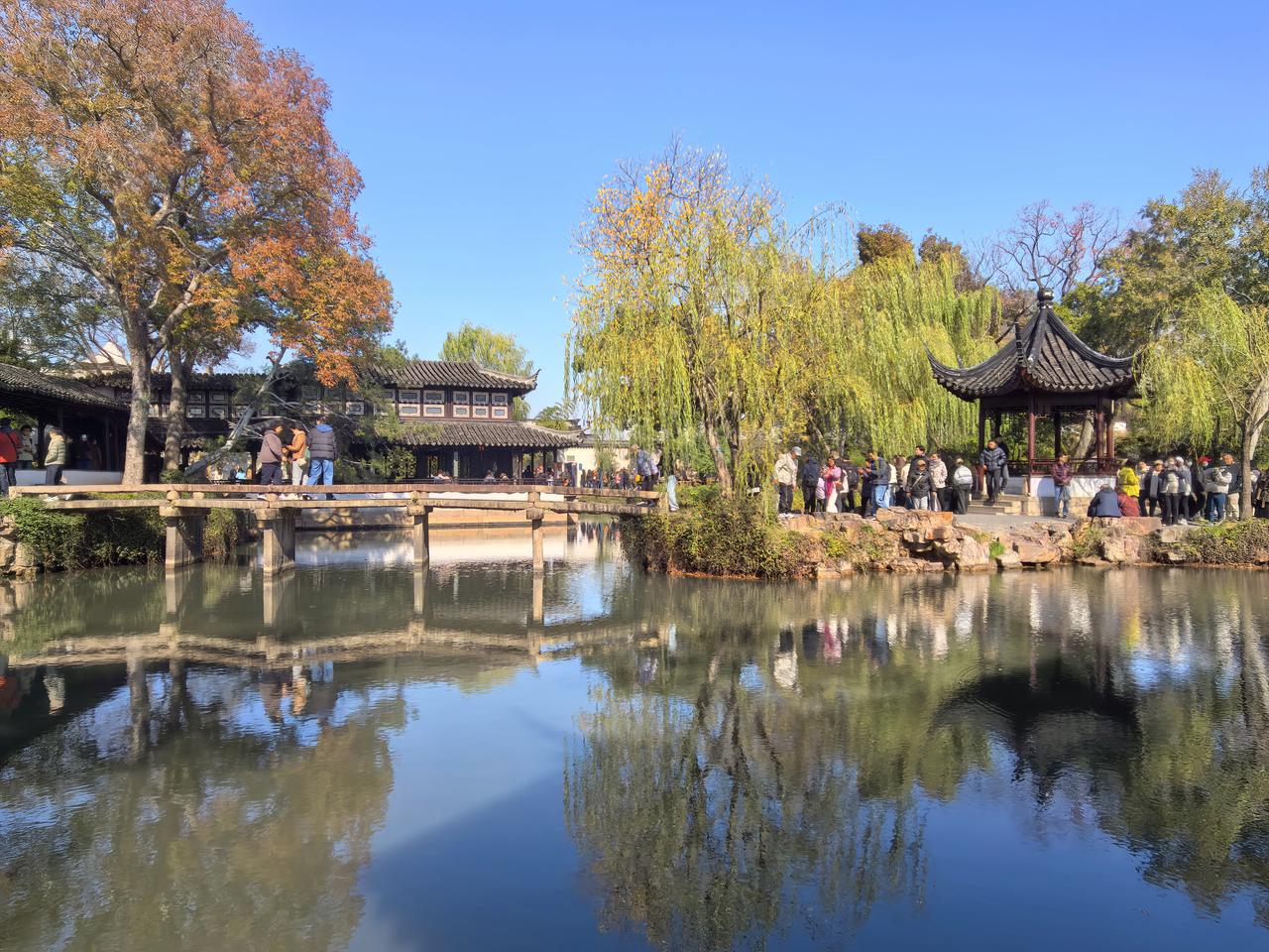 姑苏初秋,拙政晴光里的田园诗意。 冷空气过境后的苏州,凉意浸在风里,却也把连日的阴云卷得干净。檐角的风铃晃了晃,碎金般的阳光便从云层里漫下来,落在拙政园的黛瓦粉墙上,洇出几分清透的暖意——这是本次苏州之行的第七站,恰遇园子里最澄澈的秋晴,更赶巧撞上菊花展,满院秋芳与晴光撞了个满怀。 入园便撞进一片疏朗秋意裹着菊香的景致。青石板路带着晨露的微凉,踩上去脆生生的响,两侧的鸡爪槭已初染丹霞,叶片边缘凝着未干水汽,在阳光下闪着细碎光;而石径两旁、廊下花台、水畔坡地,早已被各色菊花铺成了斑斓花毯。悬崖菊顺着假山石崖垂落,粉白花瓣如瀑布倾泻,沾着晨光似缀了碎钻;独本菊亭亭玉立,墨紫、鹅黄、雪青的花盏攒着劲儿盛放,花瓣层层叠叠,或卷如绸缎,或舒如流云;更有造型精巧的盆景菊,栽在古雅陶盆里,枝桠虬曲,一朵艳黄菊顶在枝端,与旁边的红枫相映,恰似一幅秋意浓淡相宜的工笔画。风一吹,菊香清冽漫开,混着草木的湿润,深吸一口,连凉意都浸了几分甜。绕过影壁,忽见一池碧水横在眼前,水波清冽,倒映着岸边亭台轩榭、天光云影,还有池畔几丛水影菊,白瓣黄蕊映在水中,与游过的红鲤相映成趣,红、白、金、碧交织,搅碎了满池晴光,又慢慢漾开,倒像是把秋日的绚烂与静谧都揉进了水里。 沿池边曲廊缓步前行,廊下的藤蔓褪去了盛夏的浓绿,露出褐红色的枝蔓,缠绕着朱红的廊柱,添了几分苍劲。转角处忽见一株古银杏,树身粗壮,枝桠斜斜伸向天空,金黄的叶片层层叠叠,被阳光晒得透亮,风一吹,便簌簌落下几片,有的飘进池面,随波轻荡;有的落在青瓦上,铺出薄薄一层金毯。偶有老人倚着廊柱静坐,手里摩挲着落叶,目光漫过池水望向远处的见山楼,神色安然——这般景致,恰是苏州园林里“虽由人作,宛自天开”的真意。 行至“与谁同坐轩”,檐角翘向晴空,轩前几竿翠竹疏朗有致,阳光穿过竹叶的缝隙,在地上投下斑驳的光影。凭栏而立,风裹着草木的清冽与菊香扑面而来,远处的假山叠石透着黛青,近处的秋花疏淡吐香,耳畔只闻风声、水声与偶尔的鸟鸣,尘世的喧嚣仿佛被这园墙隔绝在外。想起古人“晚来天欲雪,能饮一杯无”的闲情,此刻虽无雪,却有晴光满院、菊香盈怀,已是人间好时节。 转过小飞虹,桥面轻拱,倒映在水中如半月凌波,桥畔的芦苇荡泛着浅白,随风摇曳出细碎的声响。岸边的亭子里,有游人轻声闲谈,话语被风揉碎,混着银杏叶的簌簌声与菊香,倒成了园景的注脚。抬头望去,湛蓝的天空下,黛瓦与黄叶、艳菊相映,水光与天光交融,每一步皆是景致,每一眼皆藏韵味——这便是拙政园的秋,清冽而温柔,静谧却生动。 冷空气带来的凉意,早已被满院晴光、秋意与菊香驱散。作为苏州之行的第七站,拙政园的秋晴与菊展,恰似一场不期而遇的惊喜,让人流连在亭台水榭间,醉心于光影流转与花香弥漫里,把姑苏的秋,悄悄藏进了记忆深处。原创作品 随手拍秋日里的拙政园 中国四大名园 走进诗情画意的拙政园 美仑美奂中国园林艺术 分享游览拙政园感受