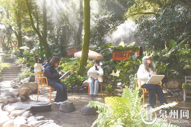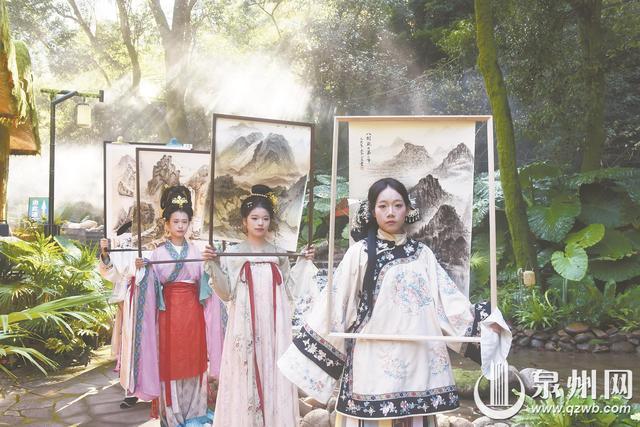 活动当天,泉州工艺美院陶瓷艺术学院的学子们以石牛山实景为“画布”,现场创作数十幅山水佳作:或勾勒“岱仙双瀑飞流直下”的磅礴,或晕染“云海漫过主峰”的空灵,将传统水墨技法与现代审美创意相融。更具巧思的是,学生艺术展演团队化身“行走的国画”,模特身着古装扮演李白、徐霞客、苏轼等文化名人,手持石牛山景致画框沿景区步道巡游,时而在瀑布前驻足“题诗”,时而与游客共赏画作。解说声与山间鸟鸣相映成趣,让游客恍入古画意境,现场掌声赞叹声不绝。