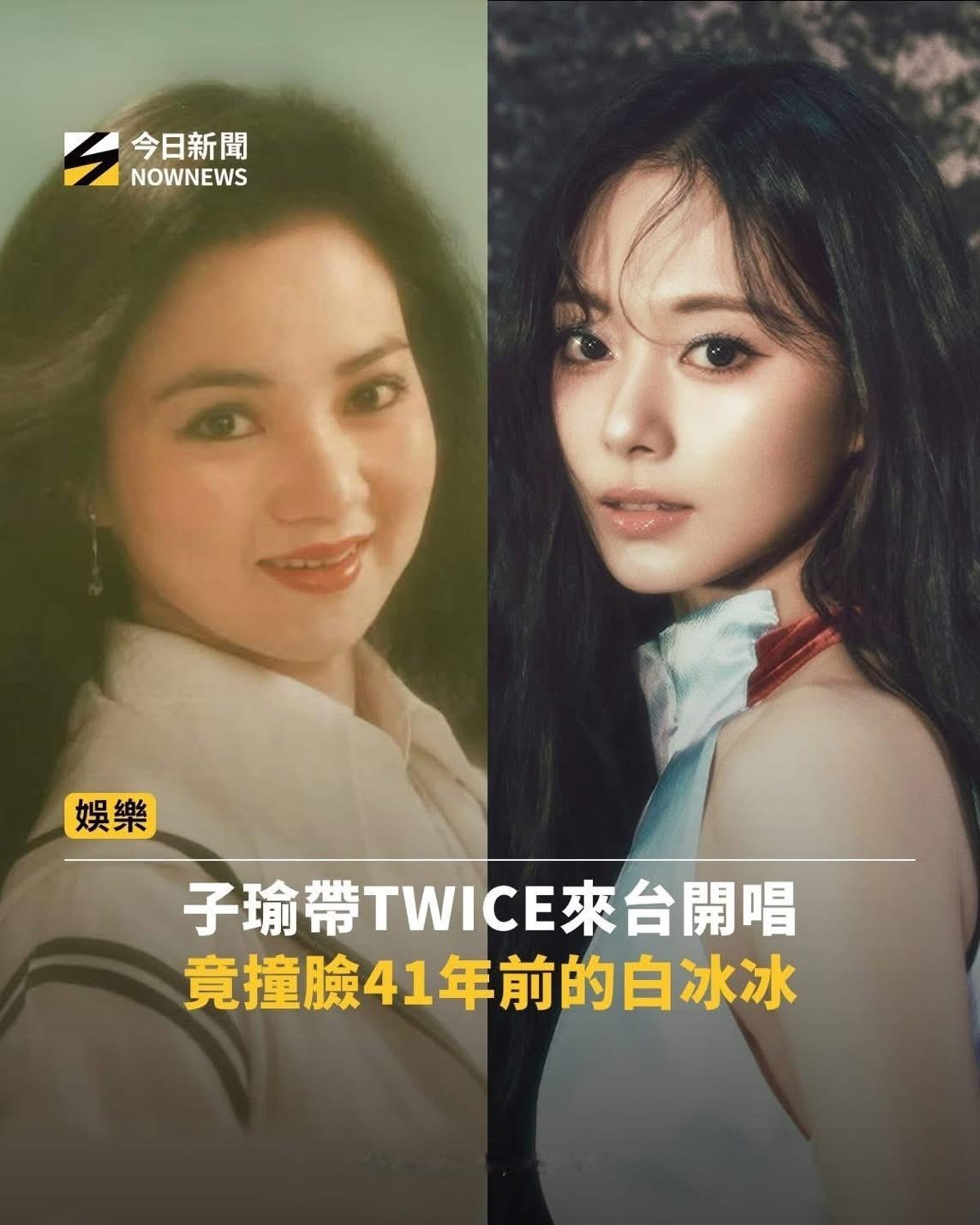 白冰冰(TW ice)回应台媒报导撞脸周子瑜,白冰冰谦虚回应:「当年的我,实在不能比,从少不经事的表情可以看出,从贫困乡村努力蹦出来的我,还略带些乡土气。」她也夸赞周子瑜的坚强与韧性,祝福她,祝福TWICE!