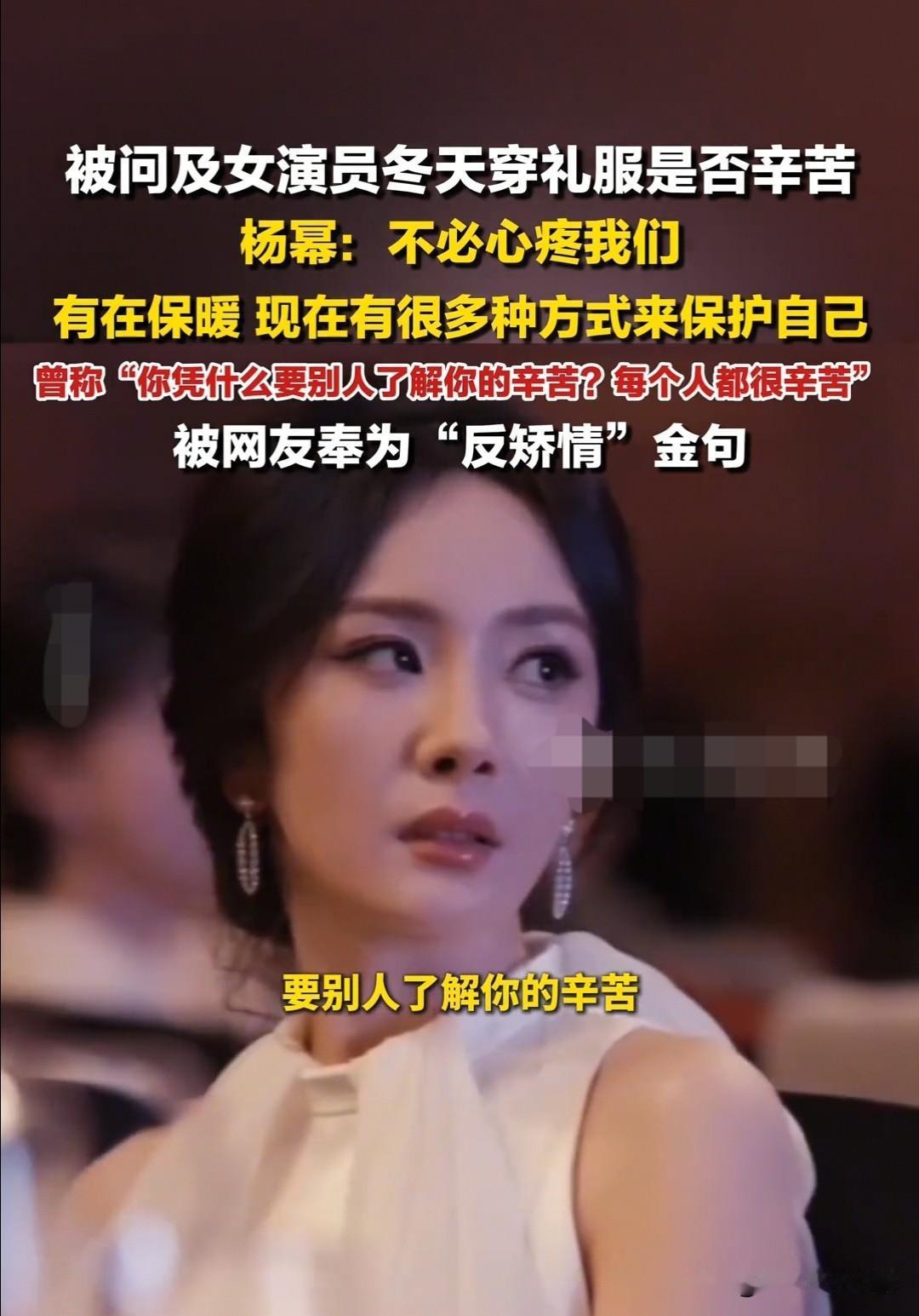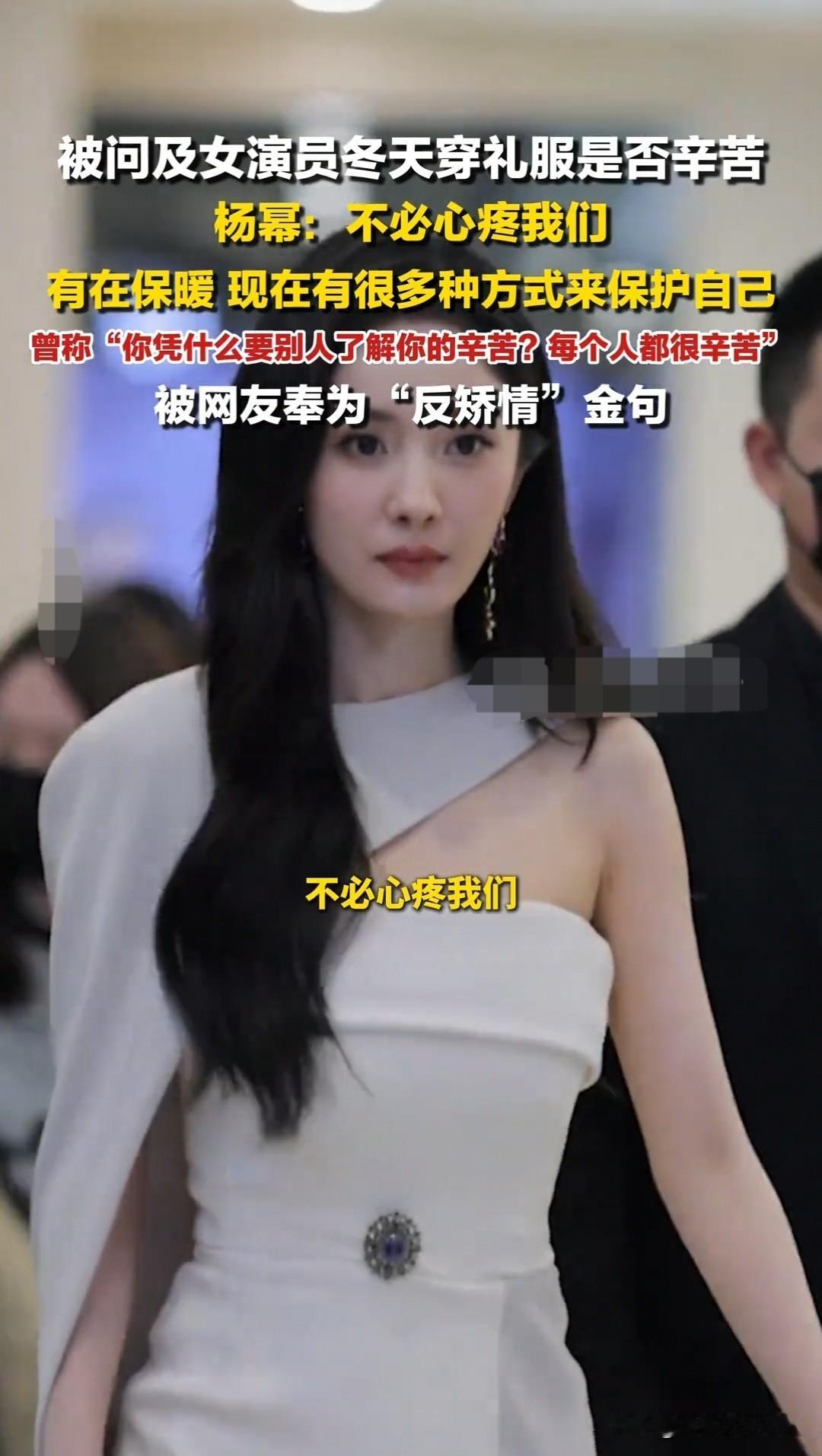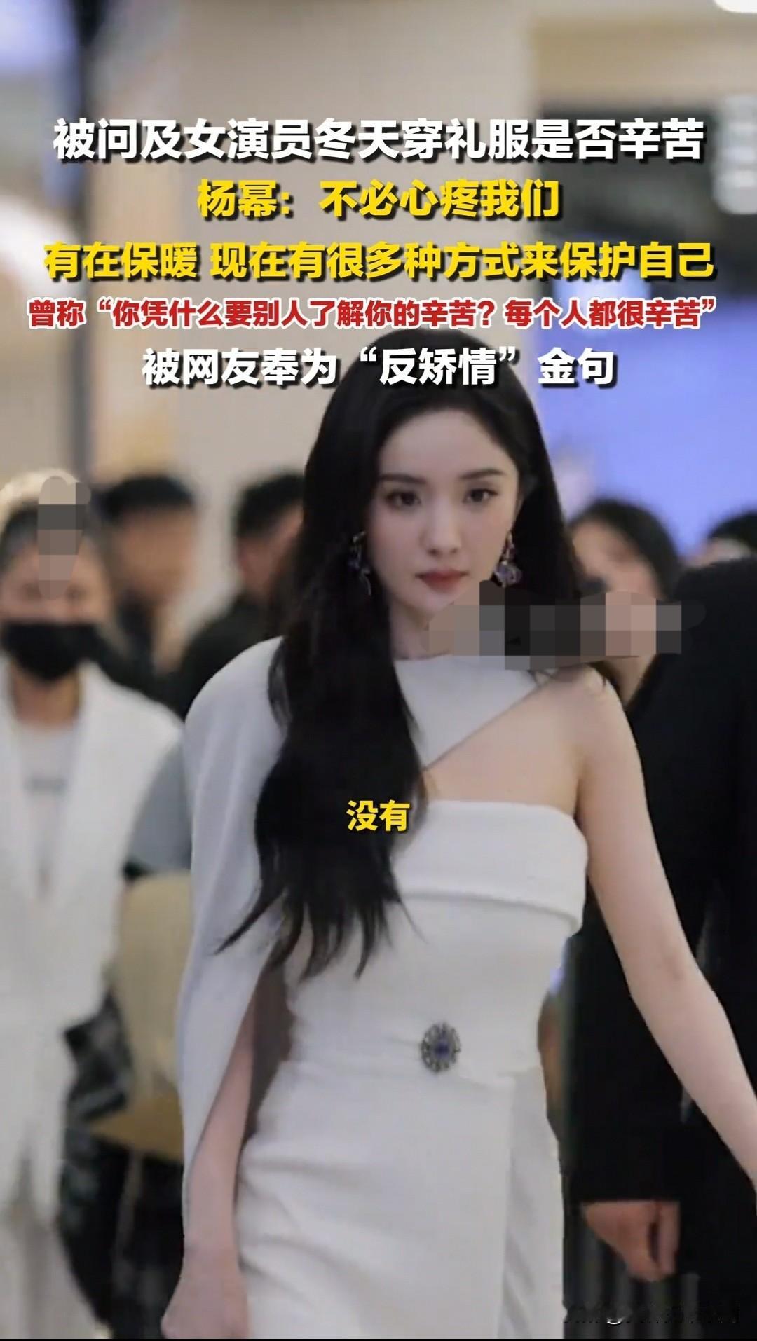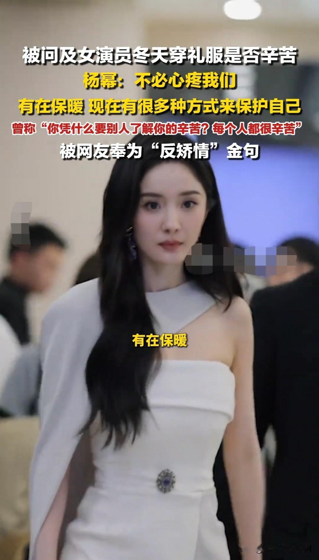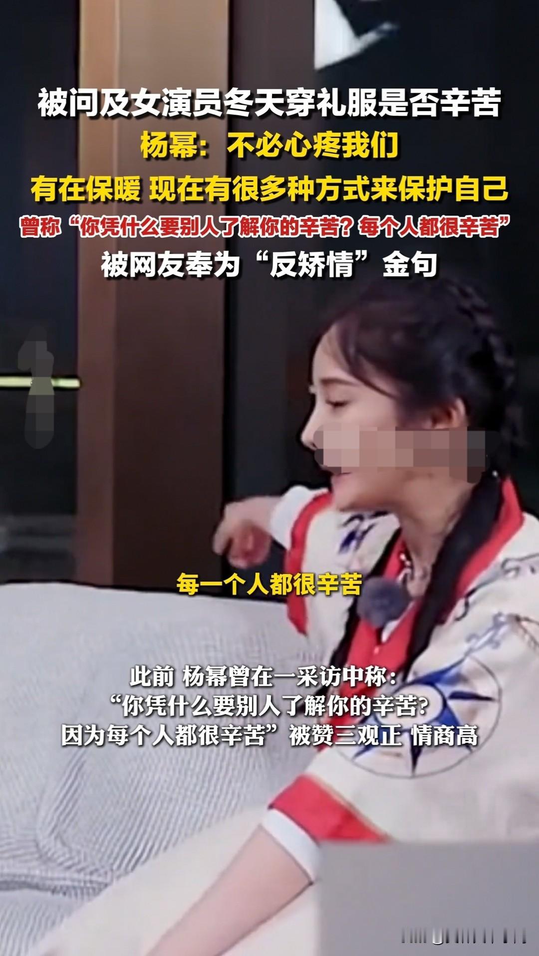 杨幂被问及女演员冬季穿礼服是否辛苦,杨幂称不必心疼我们:有在保暖,现在有很多种方式保护自己[呲牙][呲牙][呲牙]她真的很招路人喜欢,每次说话情商都好高,而且她敬业[大笑][大笑][大笑] 杨幂绝顶聪明!圈里的人间清醒![爱慕][爱慕][爱慕]杨幂很聪明也很有学识,很爱国三观很正的[赞][赞]每个人都很辛苦,所以你凭什么要让别人了解你的辛苦,真是太清醒了[比心][比心][比心]