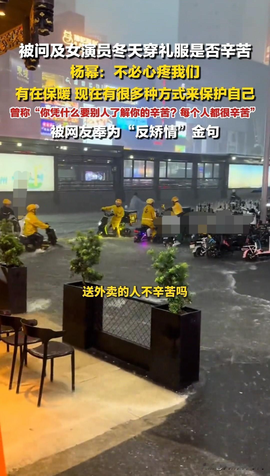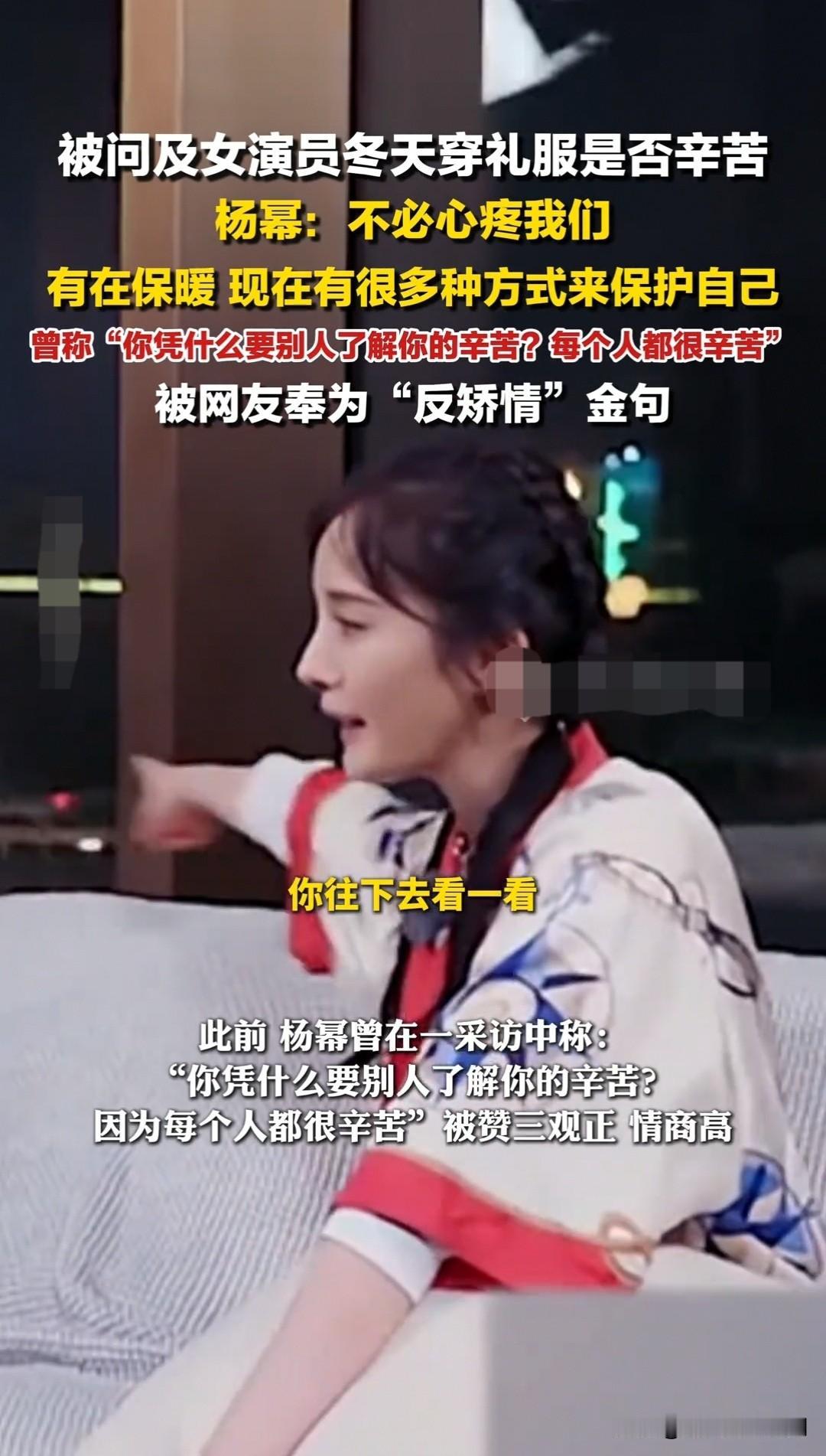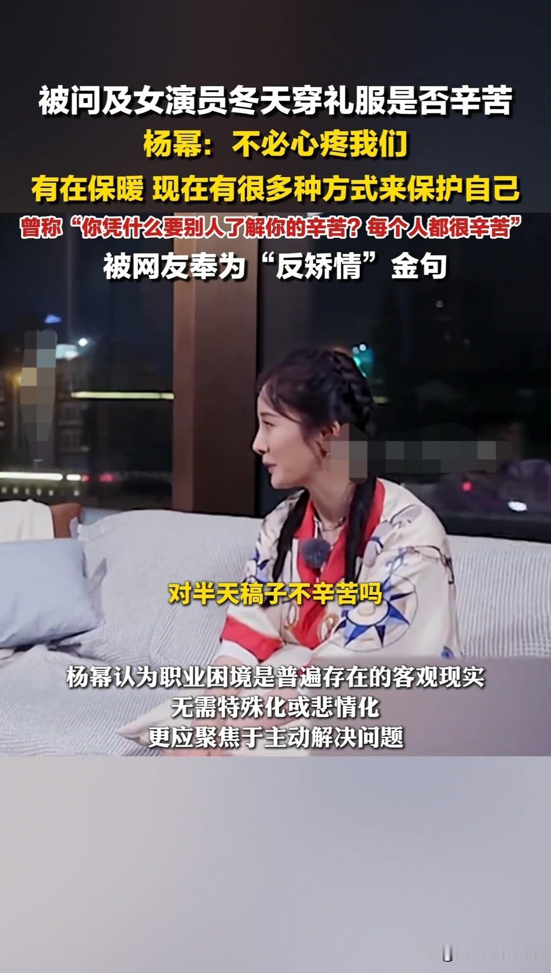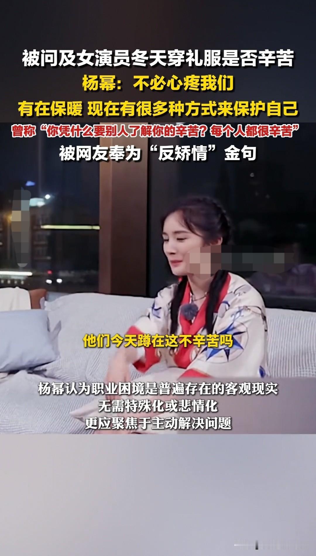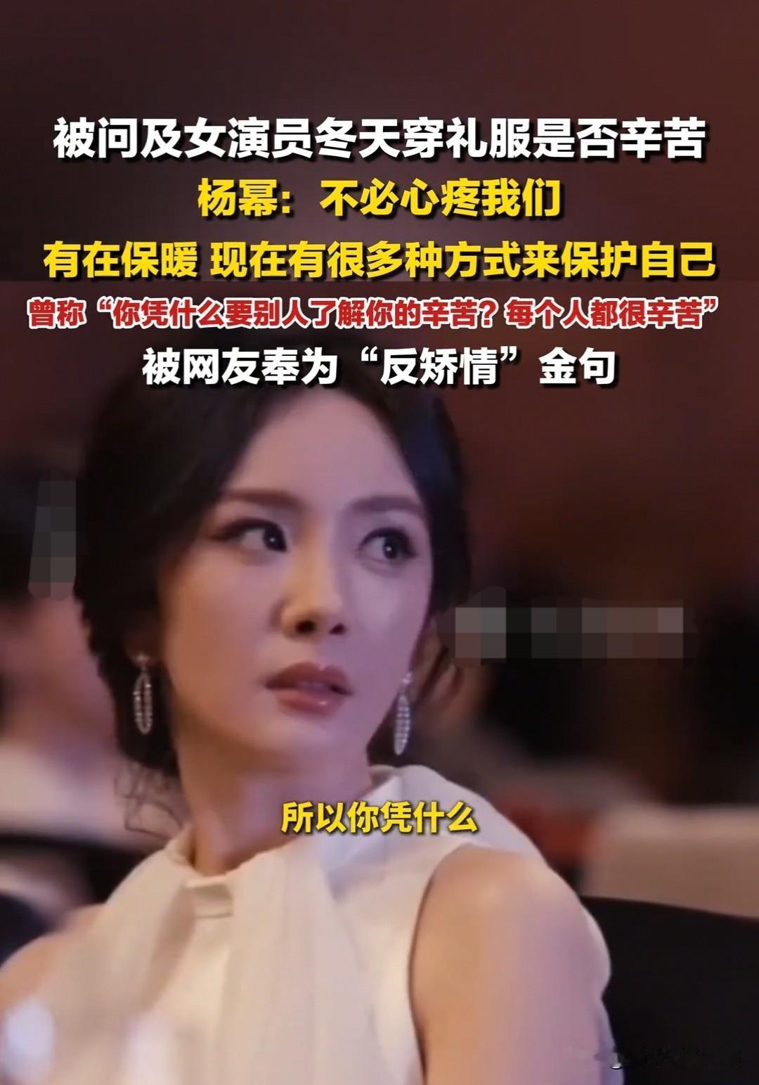 杨幂被问及女演员冬季穿礼服是否辛苦,杨幂称不必心疼我们:有在保暖,现在有很多种方式保护自己[呲牙][呲牙][呲牙]她真的很招路人喜欢,每次说话情商都好高,而且她敬业[大笑][大笑][大笑] 杨幂绝顶聪明!圈里的人间清醒![爱慕][爱慕][爱慕]杨幂很聪明也很有学识,很爱国三观很正的[赞][赞]每个人都很辛苦,所以你凭什么要让别人了解你的辛苦,真是太清醒了[比心][比心][比心]