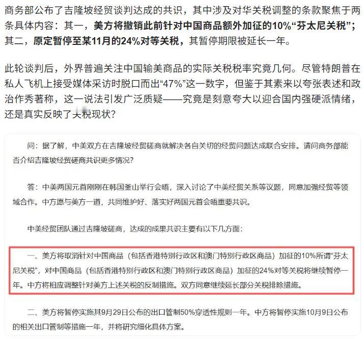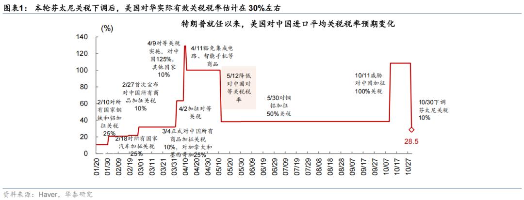 中国对美出口之谜:最新关税到底是多少 中美元首会晤以后,特朗普宣布对中国关税从57%下调10%,最新关税应该是47%。稍后白宫网站上公布最新税率也是47%。 这和特朗普说法一致。该信源显示印度的税率为50%,不过各路大神表示不同意:特朗普糊弄美国民众,实际应该是23%。 以华泰研究为例,华泰研究分析师则计算得出约28.5%,实际约23%,远低于特朗普口中的47%(见下图)。 华泰研究表示,这个实际23%与28.5%差额是正常的 ,因为关税很复杂,有一些商品是单项额外加收的,有一些是豁免的。 由于商品结构占比不清楚原因,很难得出准确得出税率,不过这个23%应该是十分离谱的。 我们可以对比同期其他国家情况,根据公开资料,我国9月份对美出口下降27%,前三季度对美出口下降15.5%,其他亚洲国家也不好受,其中: 越南:8月对美出口同比下降约2%。 泰国:8月出口增速回落至5.8%,为去年9月以来最低水平 韩国:8月对美出口同比下降12.0%,这是自2020年5月新冠疫情爆发以来的最大降幅。 其中越南对等关税46%,韩国对等关税是25%。可见对等关税冲击很严重,所以很多国家纷纷与美国签订新的贸易协定下调关税。 考虑到我国商品出口竞争力,我国目前承受的关税税负远高于韩国的25%。 所以综合来算,特朗普口中57%的说法还是相对可信的。 附税种清单: 中国商品关税=对等关税+芬太尼关税+301条款关税+232条款关税+反倾销反补贴税。 1-对等关税:加征 10%,适用于绝大部分中国输美产品,部分产品豁免。 2-芬太尼关税:加征 20%,适用于所有中国出口至美国的产品,无任何豁免。 3-301条款关税:301条款关税就是特朗普第一任总统期间加征的关税,特朗普在2018年使用该条款对超过 2000 亿美元的中国商品加征 7.5%—25% 关税。其中中国的电动汽车、电池、半导体及医疗用品等加征关税,最高达到 100%。 3-232条款关税:涉及产品包括汽车零部件、钢铝和铜,25-50%不等,不过232 关税与 10% 对等关税不叠加,优先征收 232 条款关税。 4-双反税:双反税,即反倾销税(AD)和反补贴税(CVD),是美国针对特定中国商品加征的反倾销反补贴税率。税率从 86.24% 至 504.07% 不等,部分企业面临超过 1000% 的综合税率。