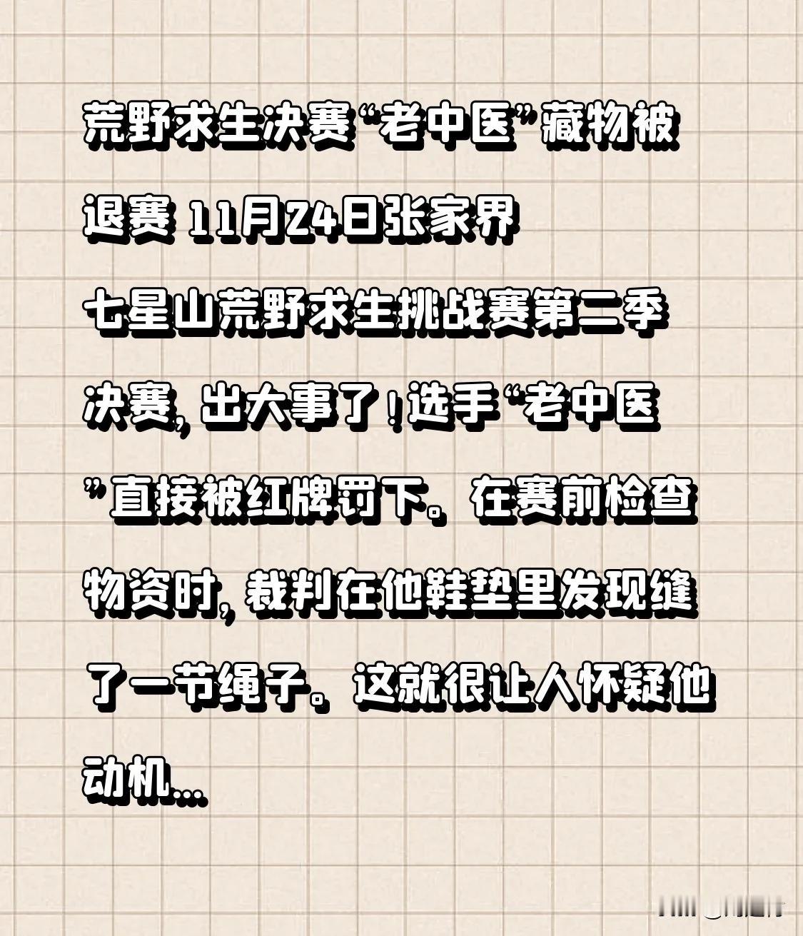 荒野求生决赛“老中医”藏物被退赛 荒野求生决赛“老中医”藏物被退赛 11月24日,张家界七星山荒野求生挑战赛第二季决赛爆出大事件,选手“老中医”被红牌罚下。赛前物资检查时,裁判在他鞋垫里发现缝着一节绳子。鉴于每位选手都能光明正大地携带一截当腰带的绳子,此举难免让人怀疑他动机不纯。 “老中医”44岁,来自四川宜宾,喜爱中医养生。赛制规定严苛,选手不能携带半决赛物资,需从零开始独立生存。他藏物的行为,直接使他失去了比赛资格。此时其他13名选手已进山,他只能遗憾退场,实在得不偿失。
