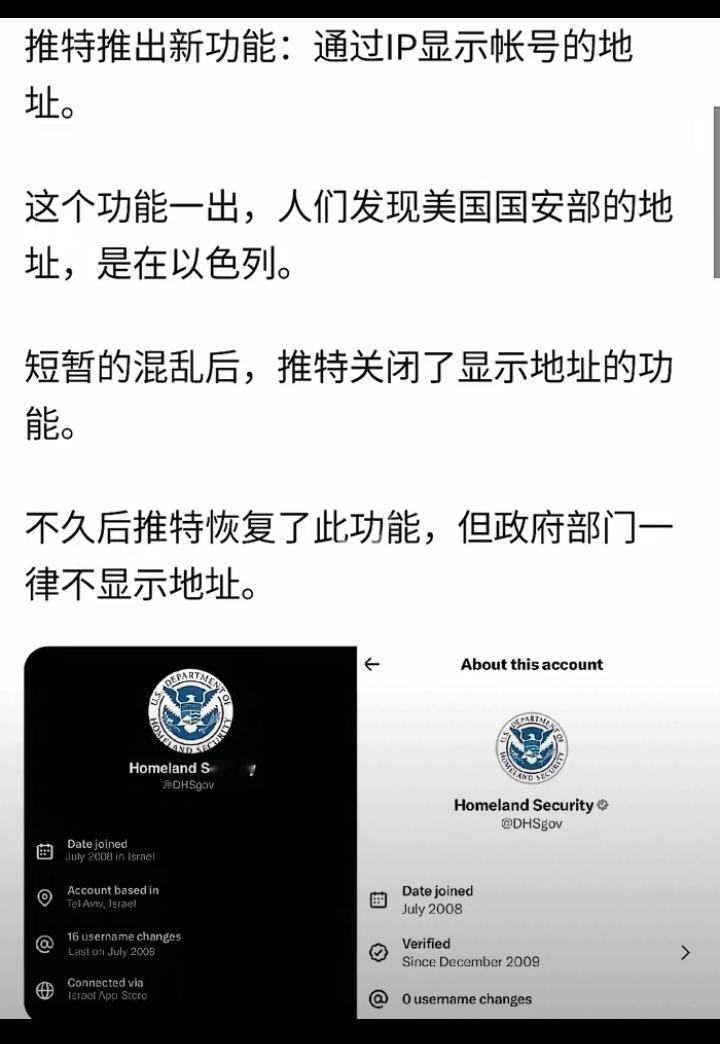 推特开放了IP地址后,人们发现,真实的IP地址耐人寻味,以往大家争论不休的事情,其实都是有标准答案的: 美国国土安全局的IP地址显示在以色列, 自称支持乌克兰的俄罗斯人,或俄罗斯“自由军团”的IP地址,大都在乌克兰, 自称加沙平民的IP地址,都在阿富汗和巴基斯坦, 自称以色列士兵的IP地址大都来自东南亚, 攻击中国的IP地址都集中在台湾和日本, 综上所述,显示IP地址后,很多问题都已迎刃而解。