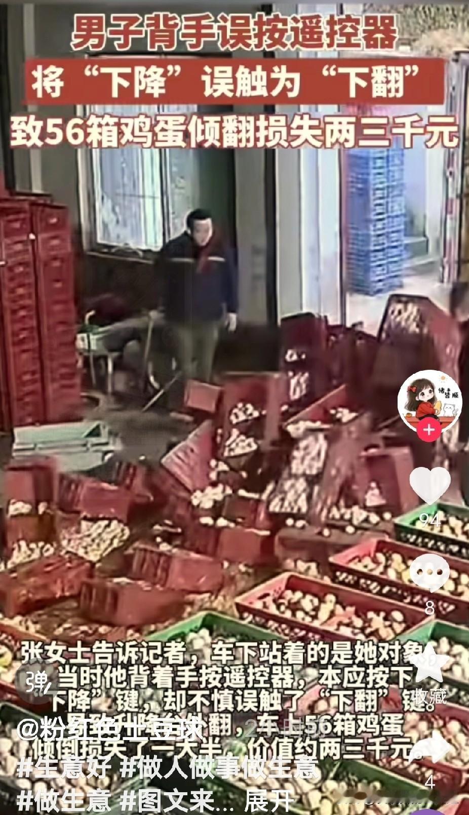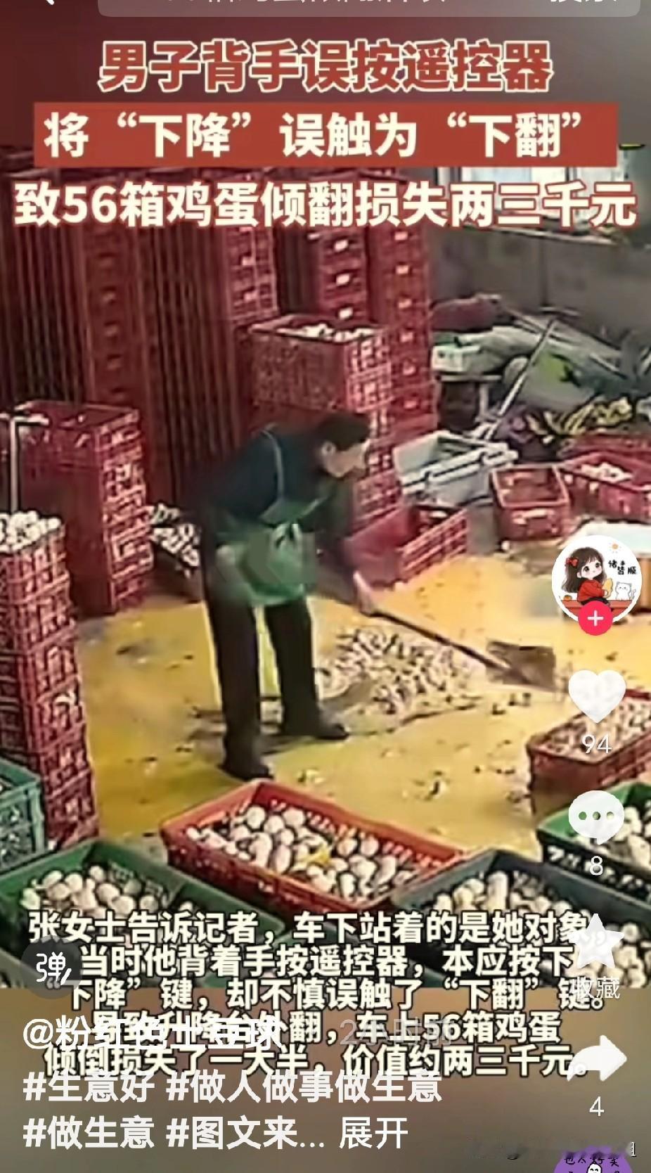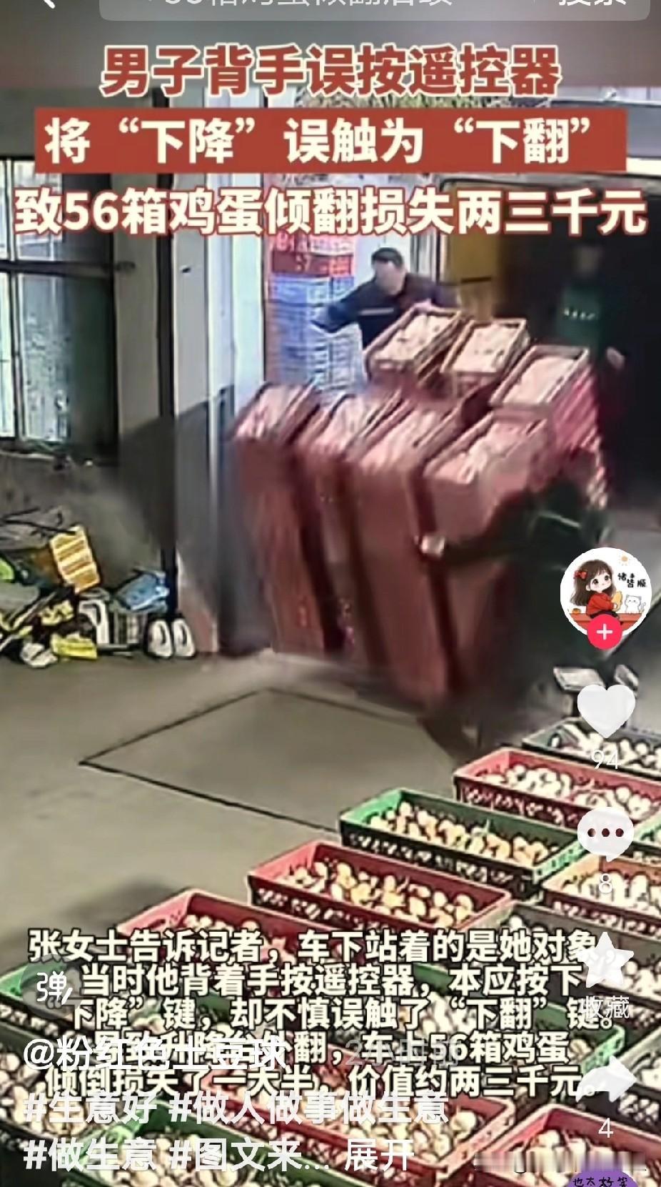 山东济南,一女子的对象在仓库卸鸡蛋,因盲目自信,竟然背着手按遥控器,不料按错键,本应按下降键,却不小心误触了下翻键,导致升降台外翻,56箱鸡蛋瞬间倾覆,打烂了一大半,损失了两三千元!女子很生气,将对象臭骂一顿! 背着手按遥控器,表面上好像挺熟练、挺潇洒,实际上手指头感觉差着呢,稍微一偏,代价就是几十箱鸡蛋眨眼报销。这种“凭感觉”的操作,在仓库装卸这种讲究精准的活儿里,真不是闹着玩的。 正规的装卸作业,对安全流程要求非常严格。像国家标准里明确写着的,操作车辆或设备都得按步骤来,启动、行驶、停车都有规矩,信号员指挥也得在指定位置,用规定动作。那些觉得“我都干熟了,闭着眼都能行”的老手,最容易在这种时候掉链子。这次误触升降台遥控器,就是个活生生的例子,说明任何时候都不能脱离规程耍小聪明。 网友们说得挺在理,这次损失两三千块,算是“花钱买教训”,只要能让人彻底记住操作设备不能儿戏,这钱花得也许还算值。怕就怕当事人肉疼一阵子之后,老毛病又犯,那下次捅的娄子可能就不是几千块钱能打住的了。装卸作业里,小疏忽完全可能引发大事故,轻则财产损失,重则伤人害命,这可一点不夸张。 这事儿也给管理人员提了个醒,光靠员工自觉还不够,得把安全规范钉死。比如,能不能要求遥控器操作时必须目视确认按键?或者给关键设备贴上防误触标识?定期抓几个反面典型说道说道,比单纯喊口号管用得多。说到底,仓库管理得把“安全第一”从墙上那句话,落到每个人每天的每个动作里。 各位读者你们怎么看?欢迎在评论区讨论。