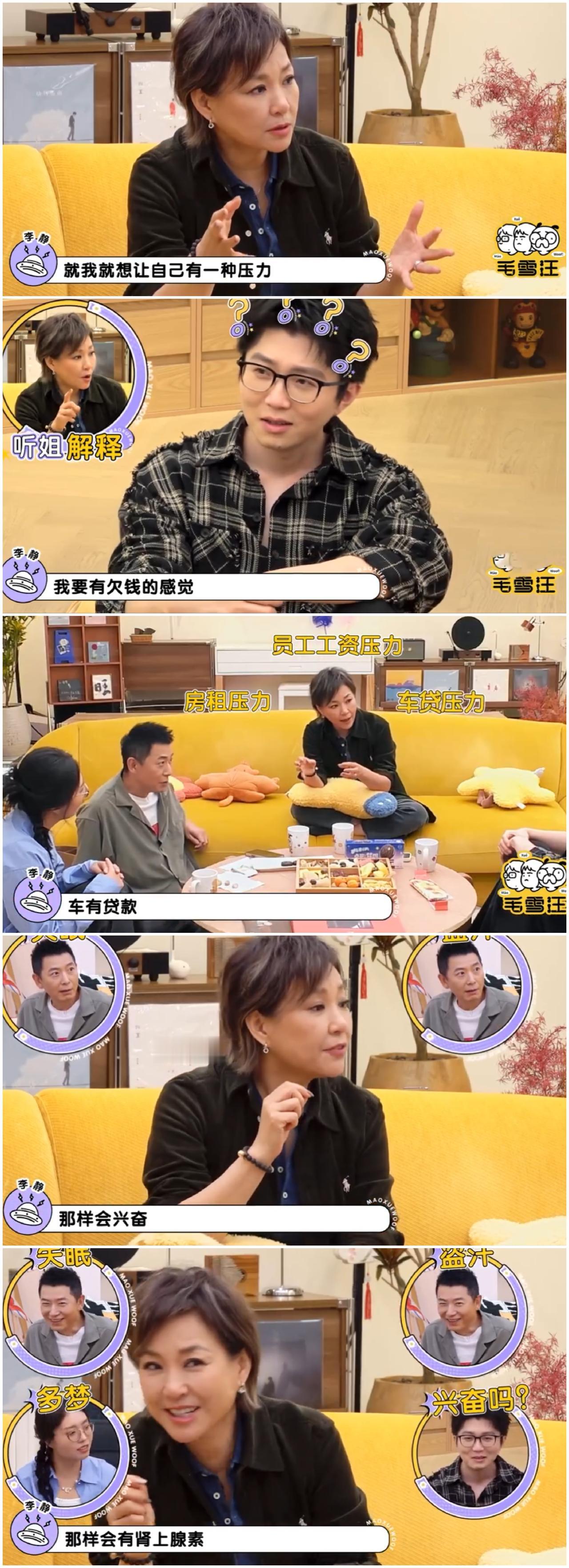 戴军,李静闲聊 谈及他们在苏梅岛民宿遭遇, 李雪琴,毛不易目瞪口呆。 李静在苏梅岛旅游, 戴军过来陪她, 晚上戴军回到民宿老房间发现 半个房顶精准砸在戴军床上, 后来发现事故原因是 空调堵水了, 水回流把房顶浸湿。 这还不是最震惊的, 最让人震惊的是, 戴军把床清理了一下, 睡在没砸坏的半边床上。 你说, 谁敢再继续睡在那里, 就不怕另一半房顶砸下来吗? 把自己砸“死”了。 这是多大的心呀。 但是听了李静的一段经历后, 我就更加理解他这个心理了。 李静贷款买了一辆好车, 就借了十万元交了一个首付, 后来她明明有钱, 3年时间可以提前还清这个贷款的, 但是她硬是用了7年时间才把它还清。 理由是她主动需求欠钱的感觉, 给自己一种压力。 当时她的压力有房租,给员工发工资,车贷, 这样的三重压力, 没有让她失眠, 反而让她兴奋, 肾上腺素上升。 让她可以更加努力的工作。 哎呀, 这样听李静一说, 就可以理解戴军 在塌了半边的屋顶的房间 睡了一个晚上的感觉了, 那是一种压力 也是一种兴奋, 让他肾上素飙升的感觉, 就很刺激。 就像人们去参加蹦极的感觉吧。 难怪李静和戴军能够成为好朋友, 连寻求刺激的方式都跟常人不同, 别人去参加极限运动, 而他们是靠欠钱与等待半个屋顶砸下来的方式。 他们能够成功, 就是这样不惧压力, 甚至主动需求压力, 让他们不断进步, 我们一般人真是受不了, 所以无法像他们一样成功。