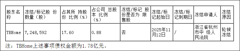 11月18日,顾家家居发布公告称,近日收到通知,TBHome持有公司的724.86万股股份于11月12日被杭州市中级人民法院轮候冻结,占其所持股份的17.60%,占公司总股本的0.88%,债权金额为1.78亿元。截至公告披露日,TBHome持有公司4117.68万股,占总股本的5.01%,累计被冻结和司法标记股份占其所持股份的100%;杭州德烨持有公司8847.15万股,占总股本的10.77%,累计被冻结和司法标记股份占其所持股份的100%。
