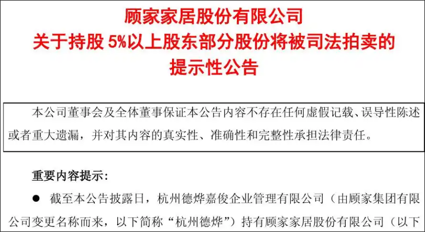 11月20日,杭州上市公司顾家家居发布公告,杭州德烨嘉俊企业管理有限公司(以下简称杭州德烨),作为顾家家居持股5%以上的股东,于2025年10月15日向法院提出重整申请。