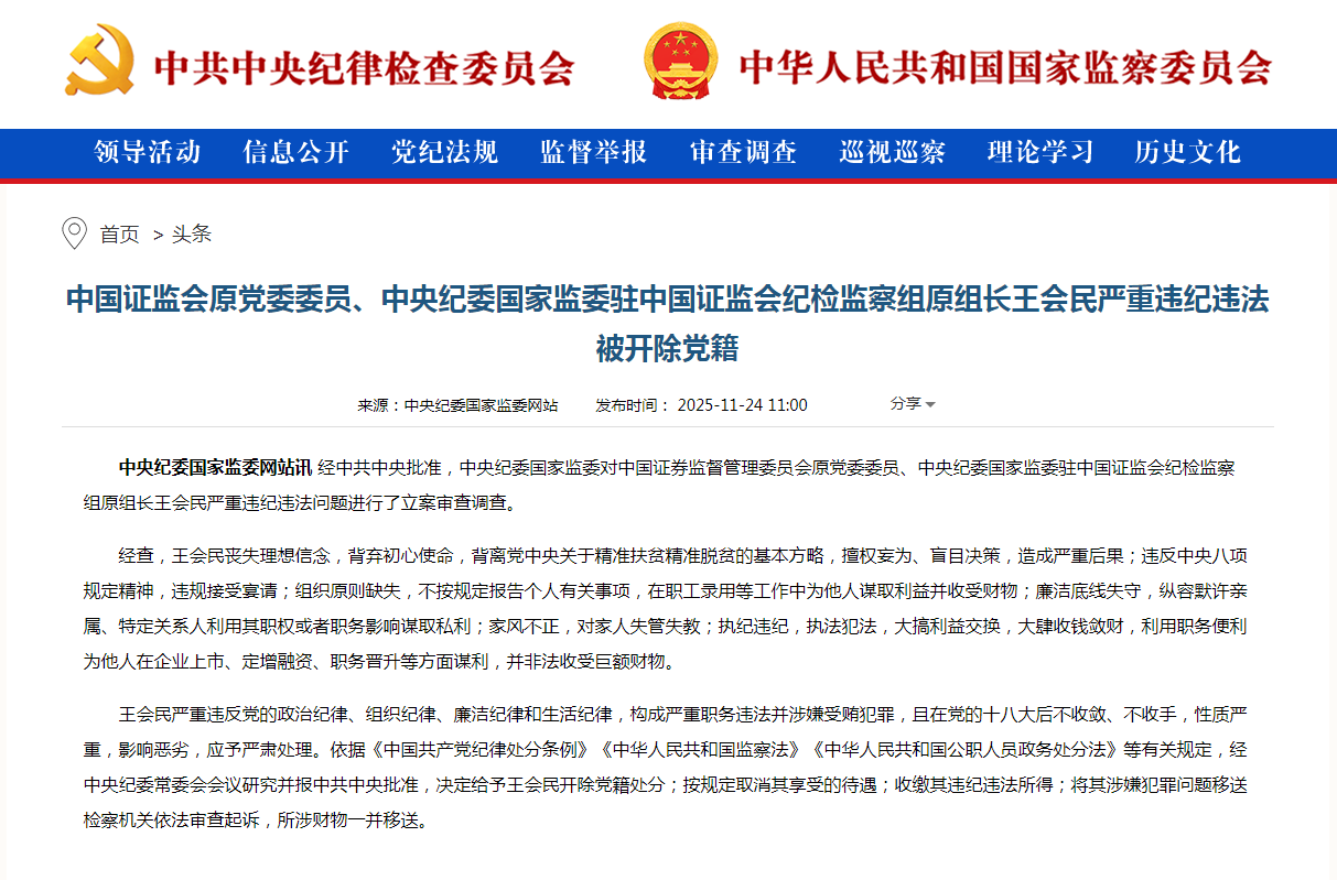 中央纪委国家监委网站讯经中共中央批准,中央纪委国家监委对中国证券监督管理委员会原党委委员、中央纪委国家监委驻中国证监会纪检监察组原组长王会民严重违纪违法问题进行了立案审查调查。