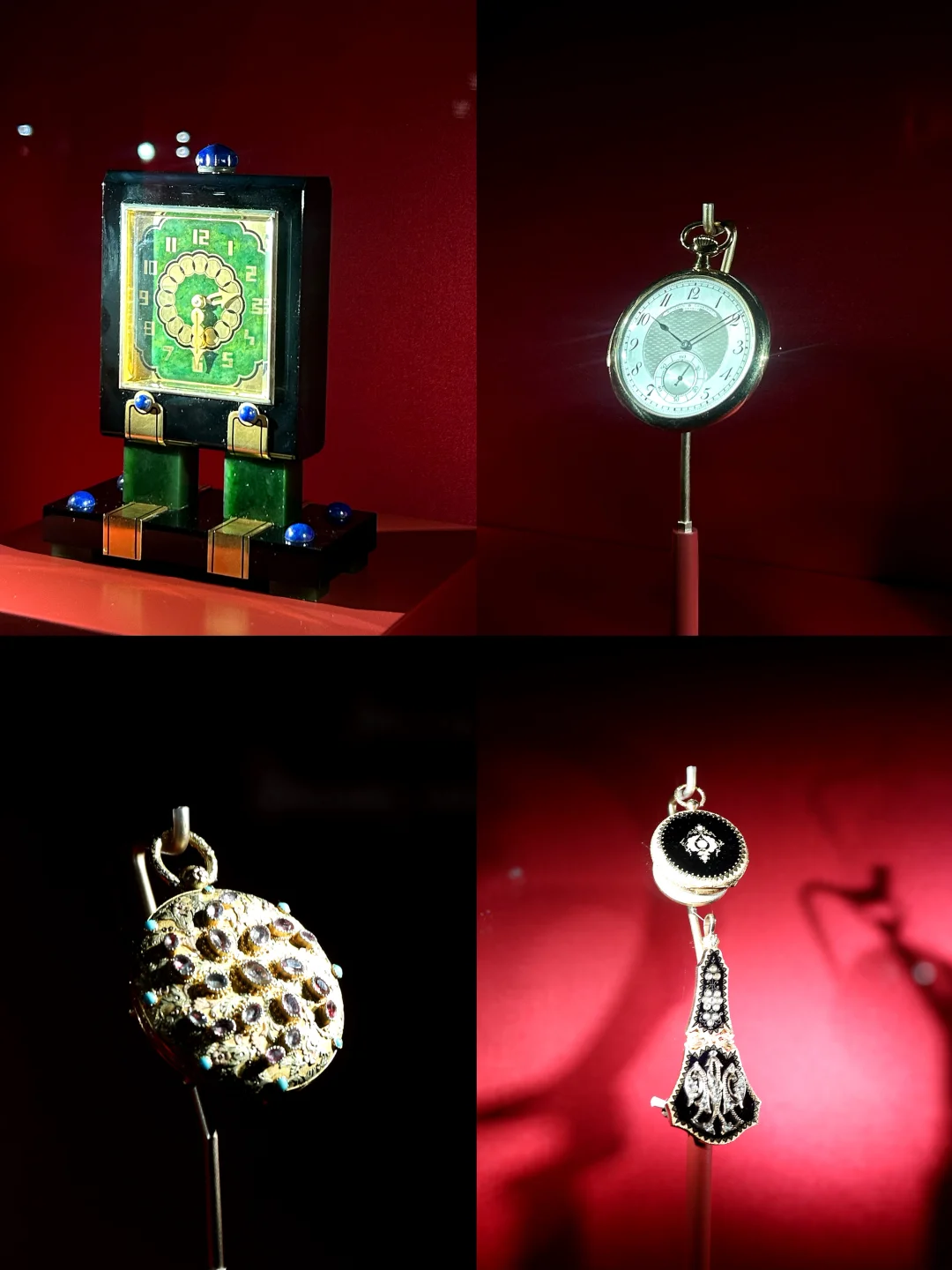 以深红色为背景的展区,仔细一看,会发现除了历史时计之外,屋顶还布满了各种文献、照片、和手稿。