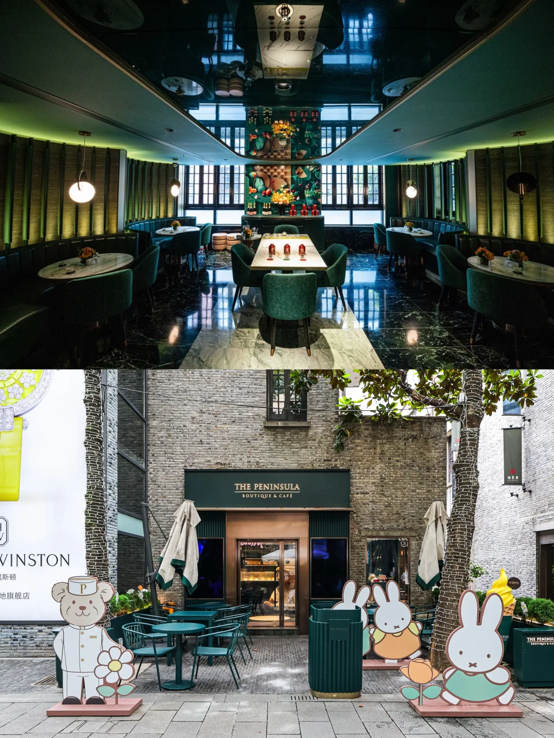 上海半岛精品与咖啡厅,墨绿丝绒沙发、黄铜吊灯、以及墨绿色的大理石地面,