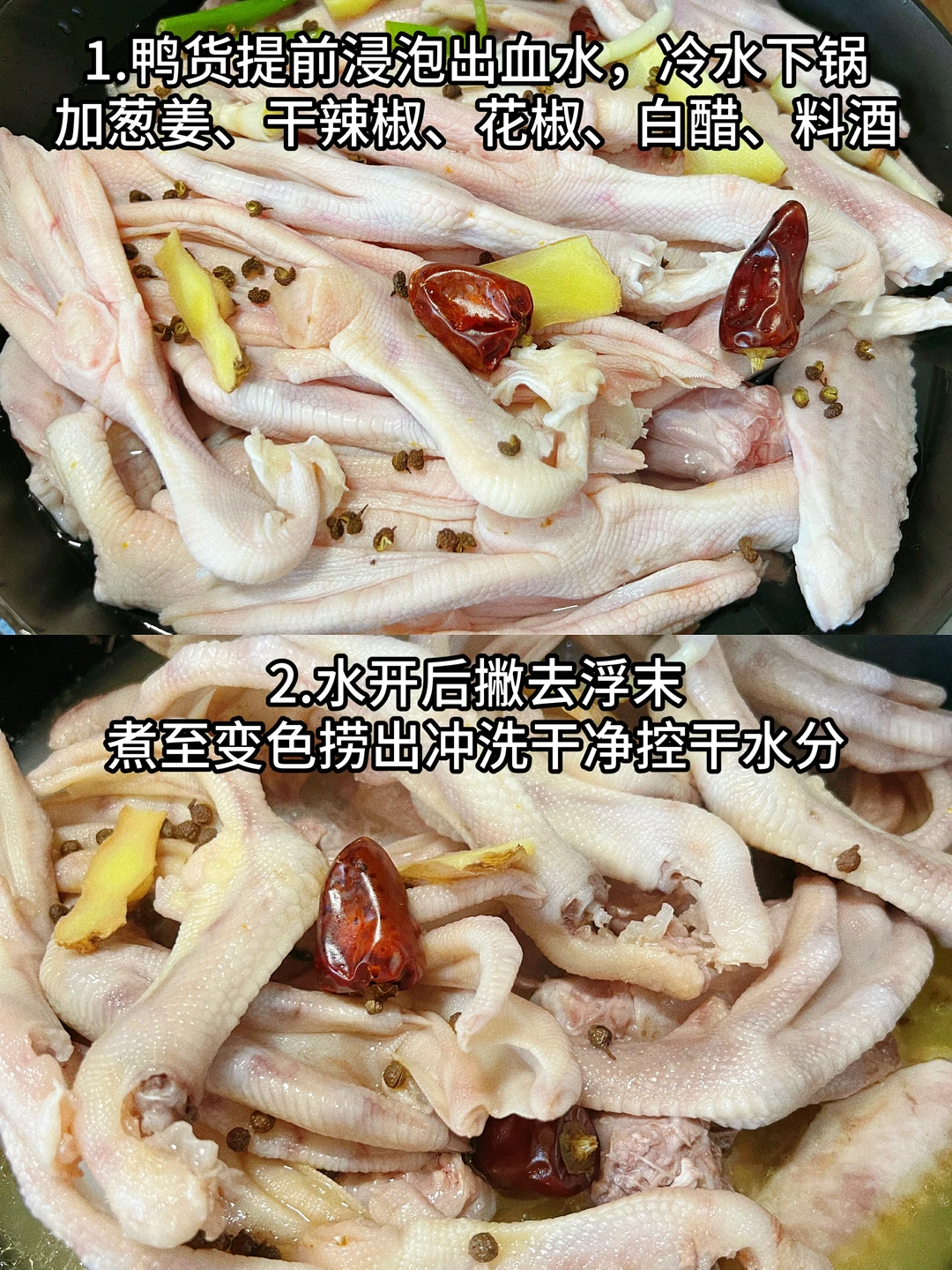1、鸭货提前浸泡出血水,冷水下锅,加葱姜、干辣椒、花椒、白醋、料酒