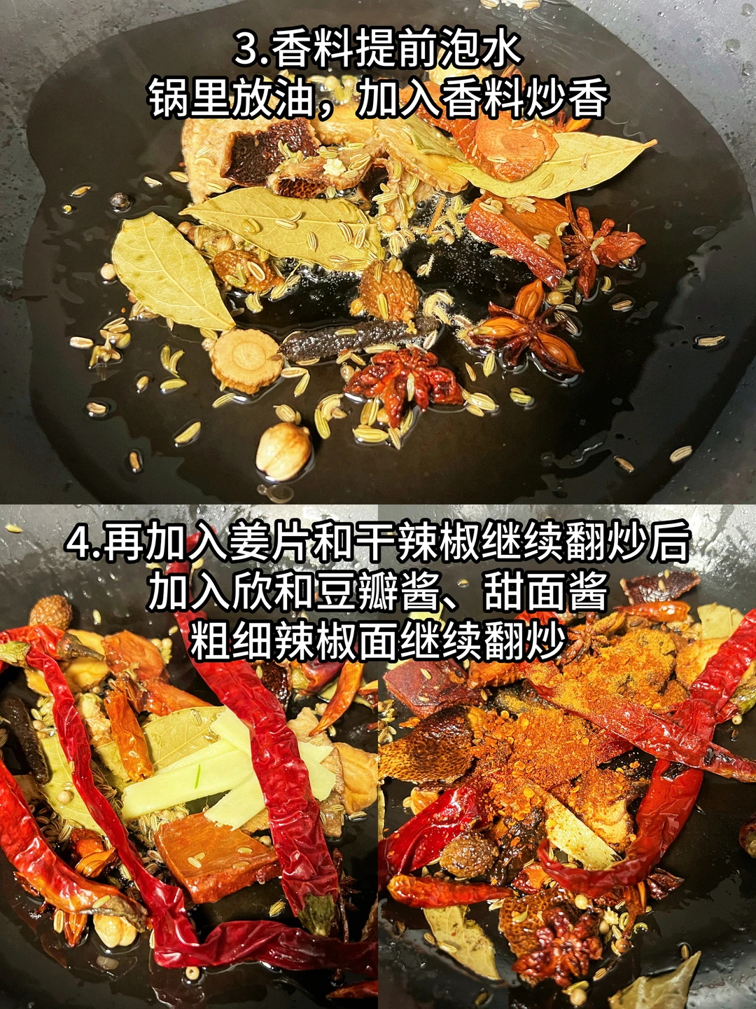 4、再加入姜片和干辣椒继续翻炒后加入欣和豆瓣酱、甜面酱、粗细辣椒面继续翻炒