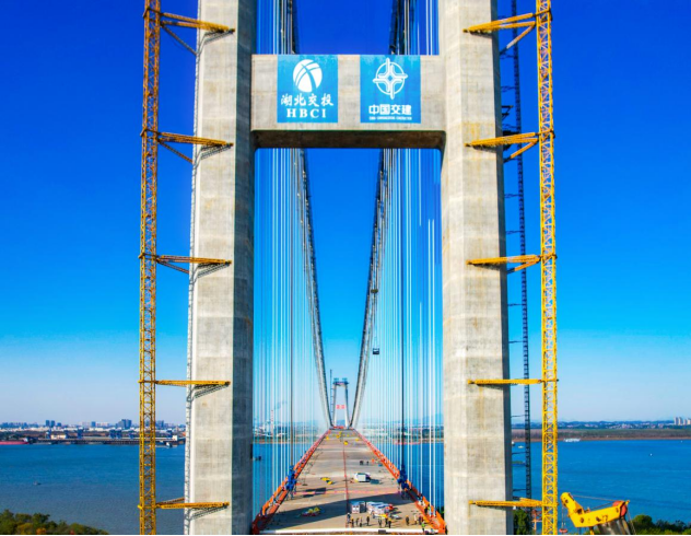 大桥建设过程中,湖北交投集团与“建桥国家队”共谋共建,大力推动四主缆悬索桥施工关键技术研究和桥梁智能化建造成套技术研究与应用。使用全国最大最强的SWD1200超级旋挖钻,并对钻头进行适应性改造,破解跨地质断裂带大直径群桩基础施工难题;研发一体化智能筑塔机,集成双泵管智能布料系统、智能蒸养及振捣系统,解决超厚壁高强大体积混凝土浇筑及温控防裂难题;应用国内首个混凝土生产全过程质量监控系统——“混凝土云工厂”,对混凝土运输、浇筑、养护全过程进行监测,从源头保障了混凝土的浇筑品质;在世界范围内首次采用等宽非对称猫道结构体系,通过采用三跨连续式、非对称等宽断面、承重索穿塔的结构形式,以及使用国内强度第一的2160兆帕高强钢丝绳及双层受力体系,解决主缆安装高空作业安全和稳定性问题;为大桥四主缆“量身定制”主缆架设智慧控制系统,可实现“实时监测-高效管控-自动响应”,为自动运营、辅助决策、智慧管理提供有力支持。