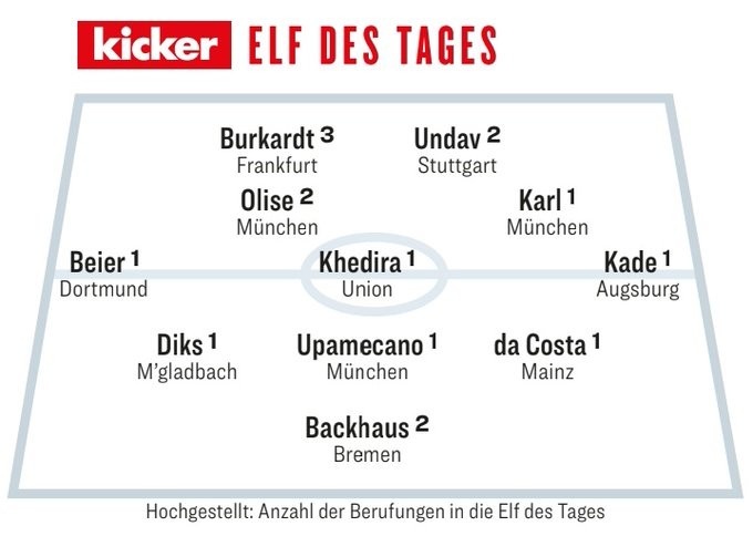 中场:拜尔(多特蒙德)、奥利塞(拜仁)、赫迪拉(柏林联合)、伦纳特·卡尔(拜仁)、卡德(奥格斯堡)