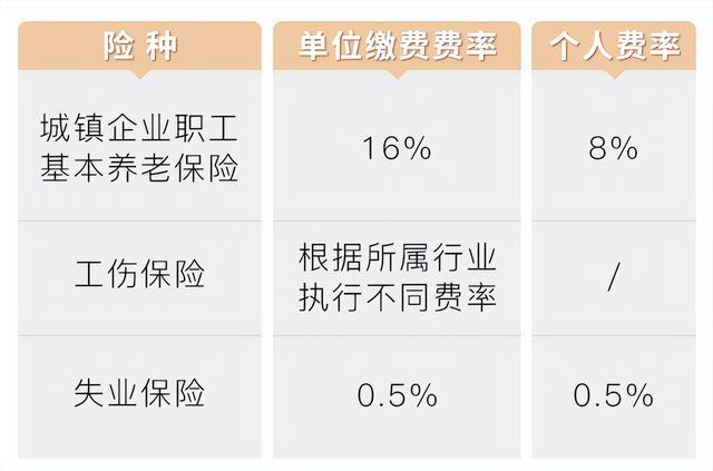 缴费费率:缴纳城镇企业职工基本养老保险、工伤保险、失业保险比例按各险种现行政策执行,具体费率如下: