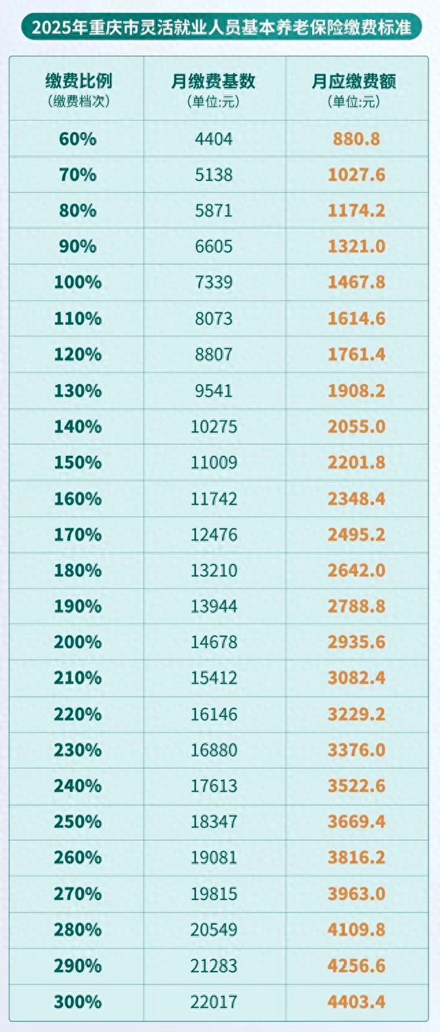 2025年,缴费基数上下限核定中使用的就业人员平均工资执行2024年全市就业人员平均工资标准,即88065元/年,按照不同月缴费基数,月缴费金额具体如下: