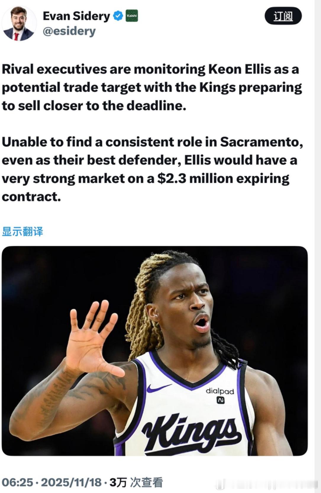 看了下国王的艾丽斯,keon ellis,确实是个不错的替补防守3d型后场…本赛