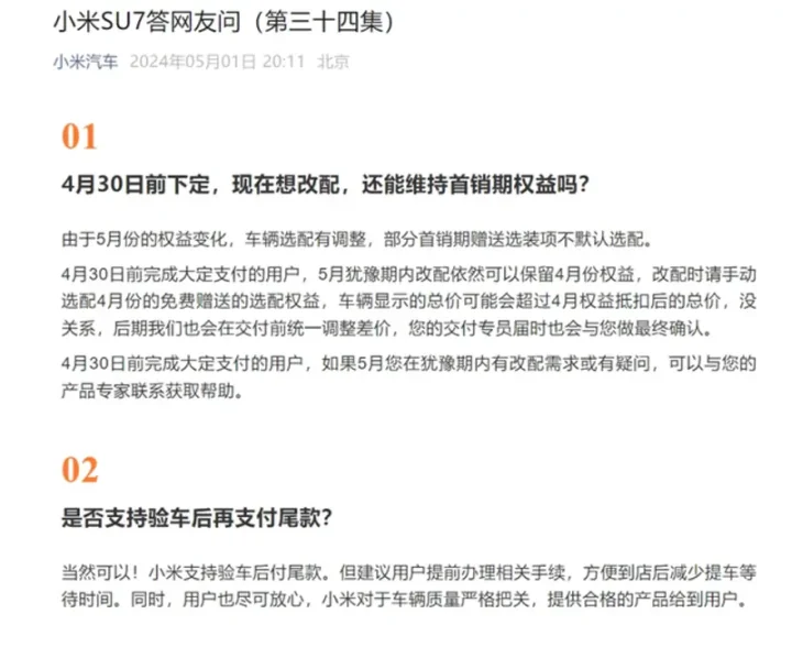 小米汽车官方微信公众号在《小米SU7答网友问(第三十四集)》中明确表示“支持验车后付尾款”