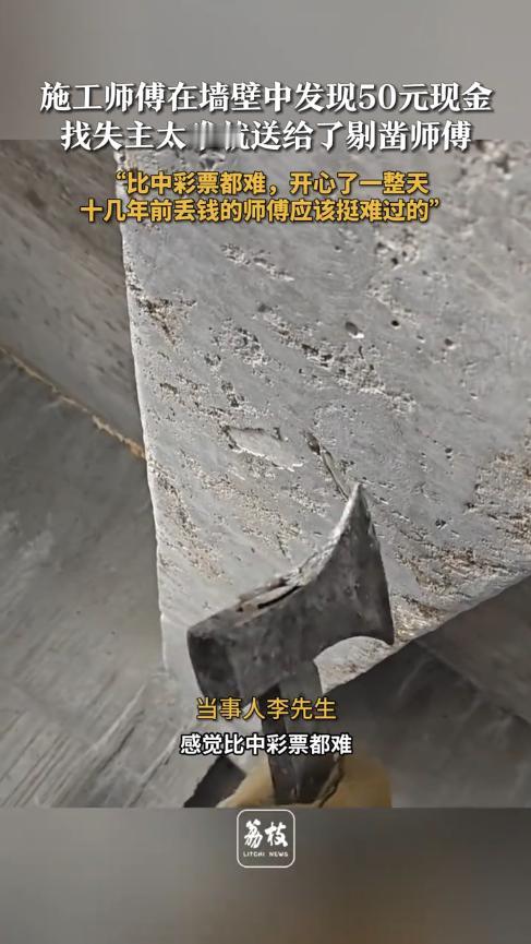 “真捡到钱了!”11月21日,安徽芜湖,一工人翻新旧屋时,发现横梁上有一抹绿色,他好奇地凑过去查看,像是面值50元的人民币!工人立马找来工具将墙壁凿开,没想到真的是50元钱,开心了一整天。网友:这概率比中彩票都难! 虽然每天都有新的小区交付,但也有已经住了十年的老旧小区,对于这样的房屋,或许会有漏水等问题,这时候就需要请工人上门检修一下。只是没想到,安徽的一位工人竟然在老房检修时,意外发了财。 当天上午,李先生带着施工队来到客户家里,这是一栋十多年前的房子,有些地方已经明显露出岁月侵蚀的痕迹,为此,业主才让他们来加固一下。 就在李先生给工人们分配完工作后,他抬头却看见梁上似乎有什么东西,李先生便和一名工人爬了上去,结果发现那竟然是50块钱! 二人开心地不得了,立即拿来斧头、电钻等,将纸币小心翼翼的取了出来,没想到,经过十多年的岁月,这张纸币依旧完好。 李先生虽然想物归原主,但是这么长时间过去了,上哪里去找当时的工人,于是他便让剔凿师傅收下了,而师傅也是开心了一整天。 网友看后表示,这概率真是太小了,如果不是李先生发现了它,这钱可能要在水泥里埋一辈子,就像是冥冥之中注定好的一样。 信息来源:《施工师傅在墙壁中发现50元现金,找失主太难就送给了剔凿师傅:比中彩票都难,开心了一整天,十几年前丢钱的师傅应该挺难过的。》荔枝新闻
