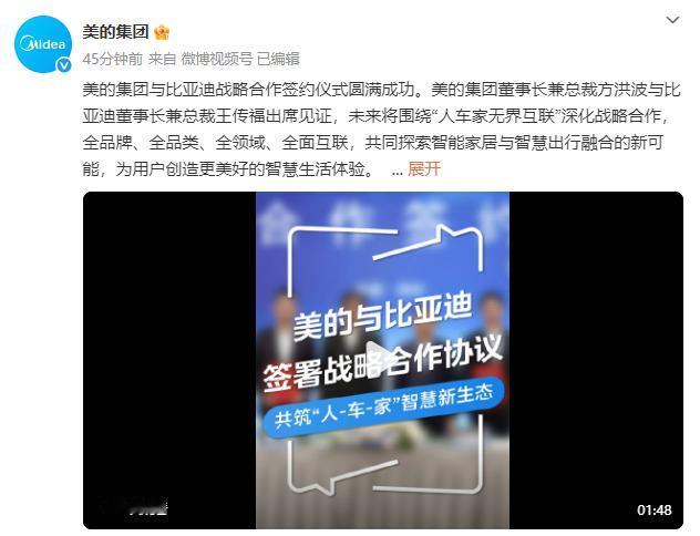家里的空调能控车?比亚迪美的这波合作,真是把智慧生活玩出了新花样。 你能想象吗?下班路上在比亚迪车里提前打开美的空调,到家就能享受舒适温度;早上在家通过美的智能音箱,一键让汽车提前启动调温。2025年11月21日,比亚迪与美的的战略合作签约,让这些曾经只在想象中的场景,真真切切要走进普通人的生活了! 很多人可能会问,车企和家电企业合作,不就是简单连个网吗?还真不是。这次比亚迪和美的的联手,藏着对“人-车-家”生态的深层思考。 要知道,过去不同品牌的智能设备常常“各自为战”,汽车控不了家电,家电也管不了汽车,用户体验总是差了点意思。而这次双方直接打通底层数据,从AI智能体协同到技术接口标准化,就是要解决“互联互通”的核心难题,不是表面功夫,而是真真正正的系统级融合。 而且这种融合对咱们普通消费者太实用了。比如冬天出门,不用再下楼挨冻热车,在家就能远程备好车;夏天出差回家,路上就能提前把家里空调开好,这种“主动式”的便利,才是智慧生活该有的样子。 更贴心的是,不只是比亚迪的腾势N8L、2026款夏等车型会先用上这功能,后续全品牌车型都能接入美的、COLMO、小天鹅等多个品牌的家电,不管你家里用的是哪个系列的美的产品,都能轻松联动。 线下体验也很懂用户心思,以后去比亚迪4S店,说不定能直接体验到全套美的智能家居;去美的门店,也能近距离感受比亚迪的智能汽车,不用跑多个地方,就能一站式了解“车+家”的全套智慧方案。 说到底,比亚迪和美的的合作,不是两家企业的简单“抱团”,而是抓住了大家对便捷生活的真实需求。当汽车不再只是代步工具,家电不再只是单一设备,人、车、家真正联动起来,智慧生活才算真正落地。这样的合作,确实值得期待!