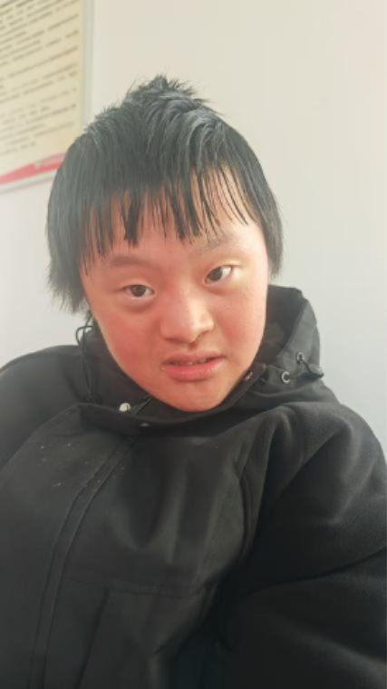受助者特征:疑患唐氏综合征,穿黑色棉服、黑色棉裤,短发,高约1米4