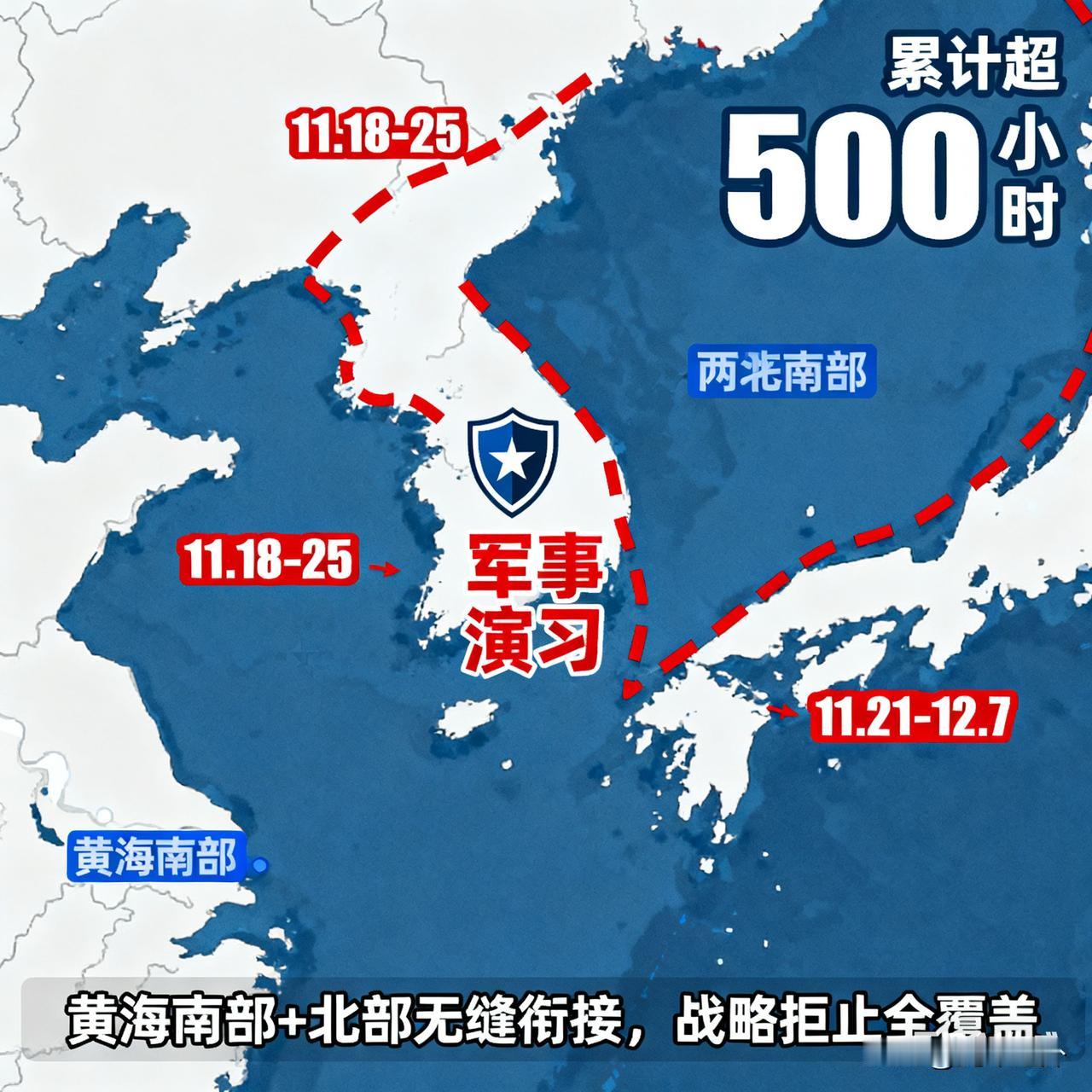 实弹封海!解放军黄海500+小时全域管控,挑衅势力越线即遭雷霆反制! 11月18日刚封黄海南部,21日又加码——黄海北部直接封锁两周到12月7日,两轮军演无缝衔接,这力度在近期实属罕见! 别光看时间长,这操作里全是信号:明着是在黄海海域开展军事任务,实则是给那些在地区兴风作浪的势力,还有想横加干涉的外部势力,划下一条不能碰的硬红线!之前总有些势力觉得“口头警告没威慑”,现在解放军用实际行动说话:黄海周边不是你想来就能来、想搅就能搅的地方! 所谓“战略区域拒止”,说白了就是把防御圈往前推,让外部干涉势力的军舰、战机不敢轻易靠近。500多小时的持续封锁,不是摆样子的“闪电演练”,而是实打实的“实战化备战”——练的是多区域联动封锁,磨的是长时间部署能力,就是要让那些心怀不轨的势力看清:解放军有决心、更有能力,守住家门口的安全,任何干涉图谋都注定落空! 之前还有人幻想“打擦边球”挑衅,现在这波军演直接打破幻想:红线就是红线,碰了就得付出代价。解放军用这种“少见的超长时军演”亮肌肉,既不是穷兵黩武,也不是小题大做,而是对地区和平稳定的最大负责——只有把威慑力拉满,才能让别有用心的势力不敢轻举妄动,这才是真正的“以武止戈”!