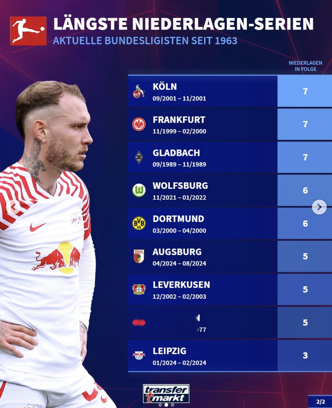 虎扑11月24日讯德转统计了本赛季德甲球队各自最长连败纪录榜。