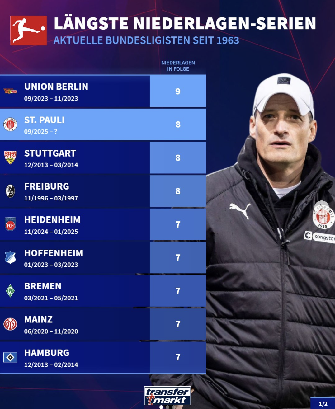 自本赛季9月以来的圣保利已经连败8场,如果下一轮客场挑战拜仁依旧输球的话,将追平柏林联合在2023/24赛季创造的9连败纪录。
