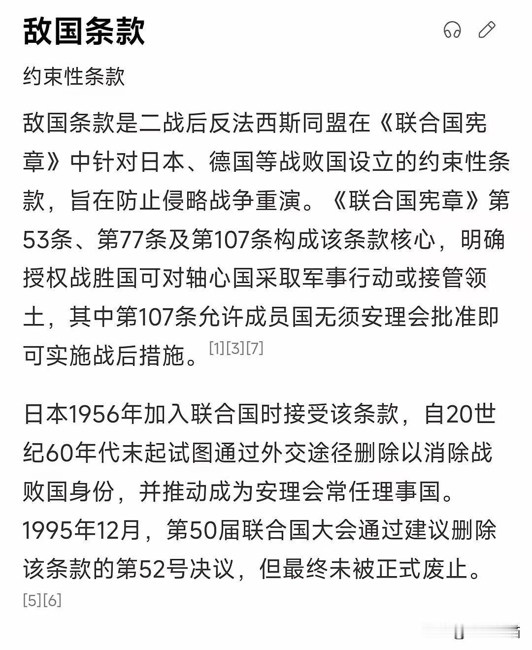 日本又在玩文字游戏 对于中国方面提起的“敌国条款”,日本外务省竟然反驳起来,说“敌国条款”已经被废除,当时中方也是同意了的。 这都哪跟哪,不但中国,任何一个五常国家都不可能把对二战战败国的敌国条款废除,因为这是对日本,德国,意大利这些轴心国的约束,是对这些挑起战争国家的惩罚,防止这些侵略行为再次复活,只要这些国家有任何的侵略挑衅行为,任何一个战胜国都可以,对其采取军事行动,或直接其接管领土。 日方提起的废除,其实是删除该条款的建议,而对于“敌国条款”并没有通过正规程序进行废除,日方之所以想要摆脱敌国条款,说明野心已经在膨胀,不得不防!