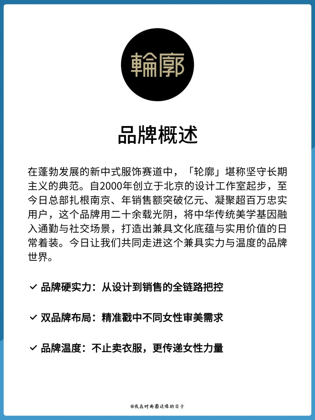 在蓬勃发展的新中式服饰赛道中,「轮廓」堪称坚守长期主义的典范。自2000年创立于北京的设计工作室起步,至今日总部扎根南京、年销售额突破亿元、凝聚超百万忠实用户,这个品牌用二十余载光阴,将中华传统美学基因融入通勤与社交场景,打造出兼具文化底蕴与实用价值的日常着装。今日让我们共同走进这个兼具实力与温度的品牌世界。