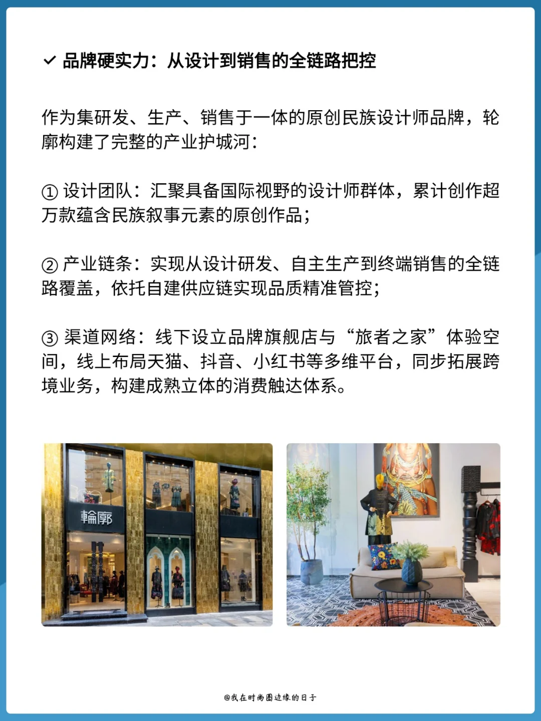 作为集研发、生产、销售于一体的原创民族设计师品牌,轮廓构建了完整的产业护城河: