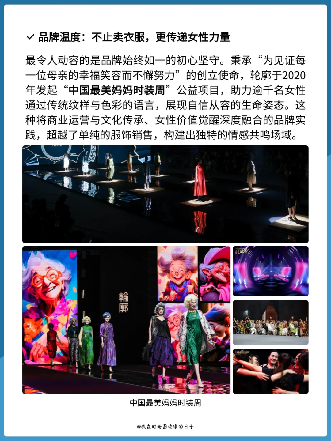 最令人动容的是品牌始终如一的初心坚守。秉承“为见证每一位母亲的幸福笑容而不懈努力”的创立使命,轮廓于2020年发起“中国最美妈妈时装周”公益项目,助力逾千名女性通过传统纹样与色彩的语言,展现自信从容的生命姿态。这种将商业运营与文化传承、女性价值觉醒深度融合的品牌实践,超越了单纯的服饰销售,构建出独特的情感共鸣场域。