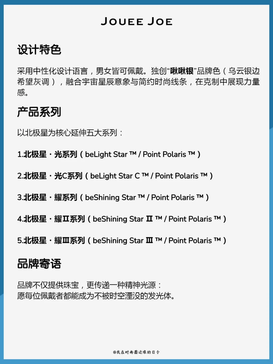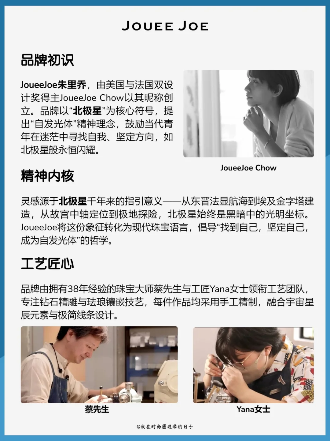 JoueeJoe朱里乔,由美国与法国双设计奖得主JoueeJoe Chow以其昵称创立。品牌以“北极星”为核心符号,提出“自发光体”精神理念,鼓励当代青年在迷茫中寻找自我、坚定方向,如北极星般永恒闪耀。