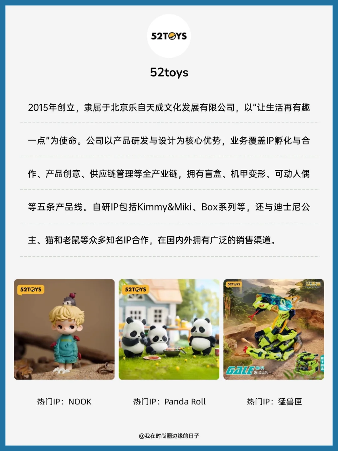 [三R] 52toys:2015年创立,隶属于北京乐自天成文化发展有限公司,以“让生活再有趣一点”为使命。公司以产品研发与设计为核心优势,业务覆盖IP孵化与合作、产品创意、供应链管理等全产业链,拥有盲盒、机甲变形、可动人偶等五条产品线。自研IP包括Kimmy&Miki、Box系列等,还与迪士尼公主、猫和老鼠等众多知名IP合作,在国内外拥有广泛的销售渠道。