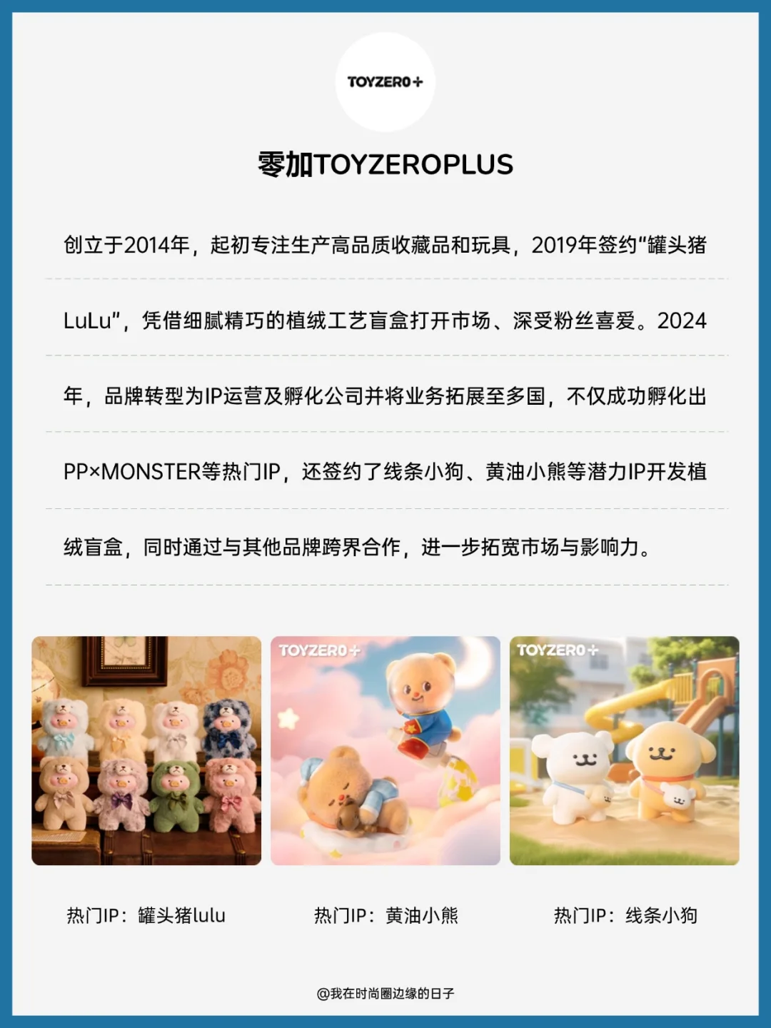 [二R] 零加TOYZEROPLUS:创立于2014年,起初专注生产高品质收藏品和玩具,2019年签约“罐头猪LuLu”,凭借细腻精巧的植绒工艺盲盒打开市场、深受粉丝喜爱。2024年,品牌转型为IP运营及孵化公司并将业务拓展至多国,不仅成功孵化出PP×MONSTER等热门IP,还签约了线条小狗、黄油小熊等潜力IP开发植绒盲盒,同时通过与其他品牌跨界合作,进一步拓宽市场与影响力。