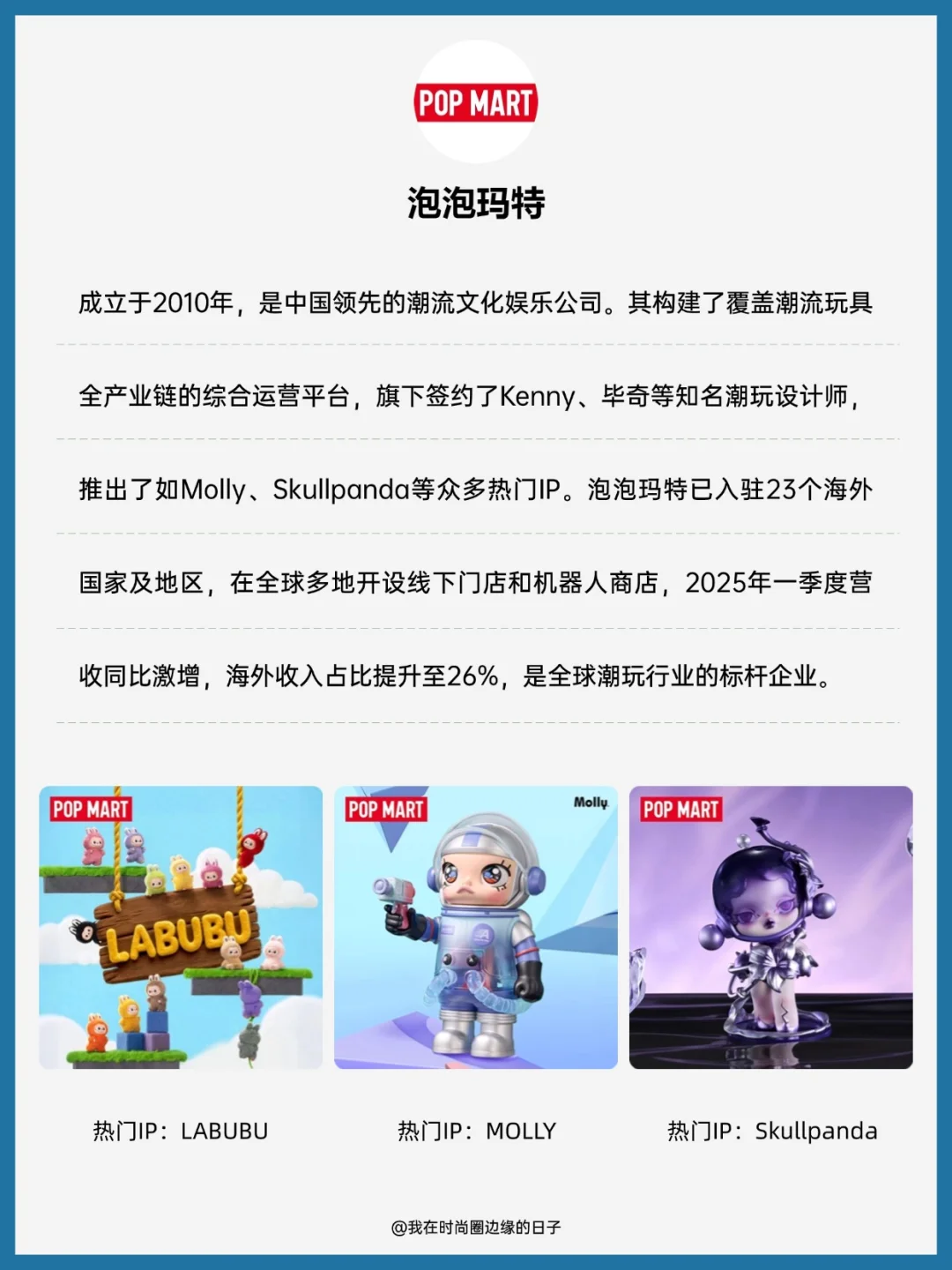[一R] 泡泡玛特POP MART :成立于2010年,是中国领先的潮流文化娱乐公司。其构建了覆盖潮流玩具全产业链的综合运营平台,旗下签约了Kenny、毕奇等知名潮玩设计师,推出了如Molly、Skullpanda等众多热门IP。泡泡玛特已入驻23个海外国家及地区,在全球多地开设线下门店和机器人商店,2025年一季度营收同比激增,海外收入占比提升至26%,是全球潮玩行业的标杆企业。