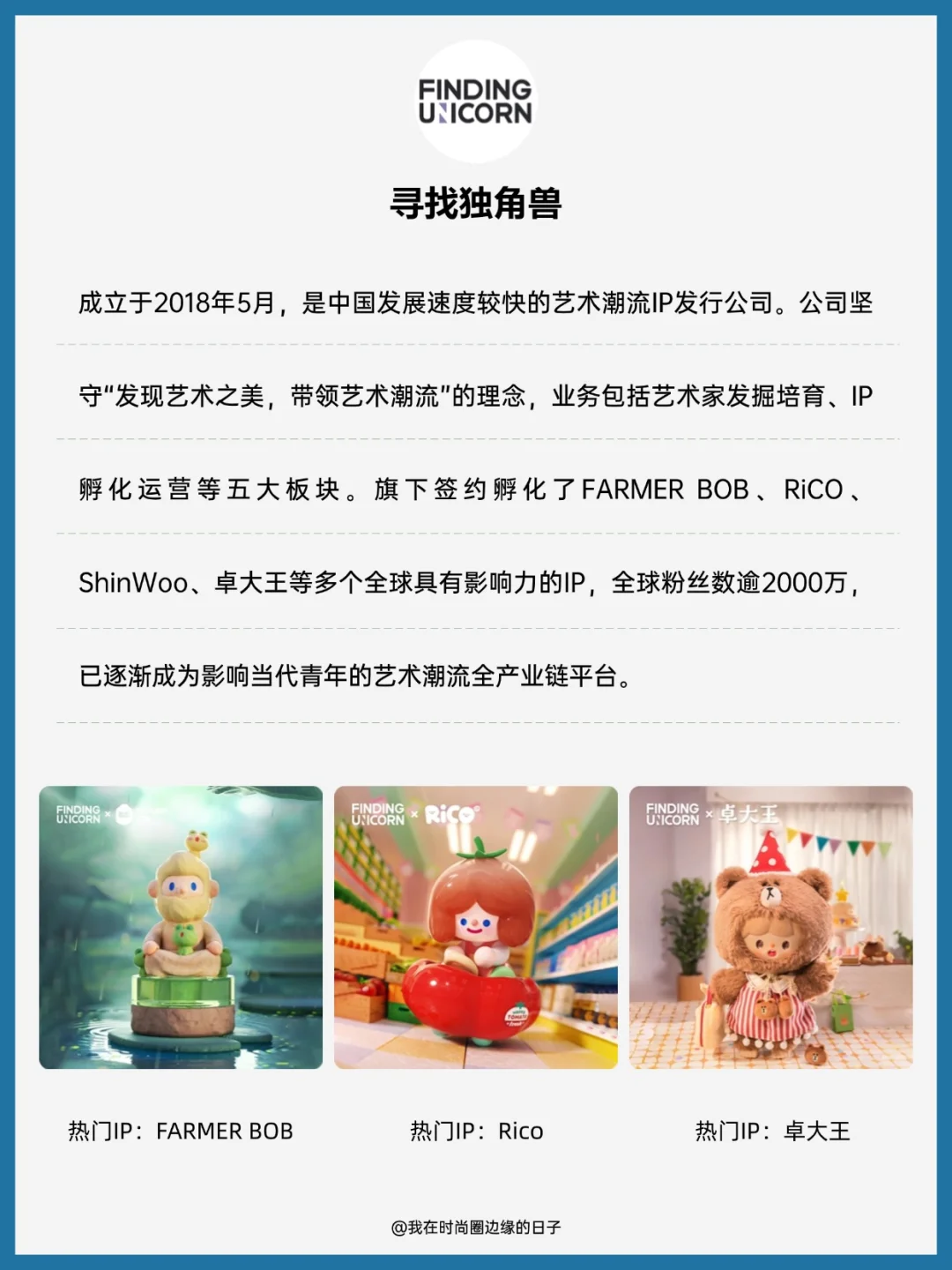 [四R] 寻找独角兽:成立于2018年5月,是中国发展速度较快的艺术潮流IP发行公司。公司坚守“发现艺术之美,带领艺术潮流”的理念,业务包括艺术家发掘培育、IP孵化运营等五大板块。旗下签约孵化了FARMER BOB、RiCO、ShinWoo、卓大王等多个全球具有影响力的IP,全球粉丝数逾2000万,已逐渐成为影响当代青年的艺术潮流全产业链平台。