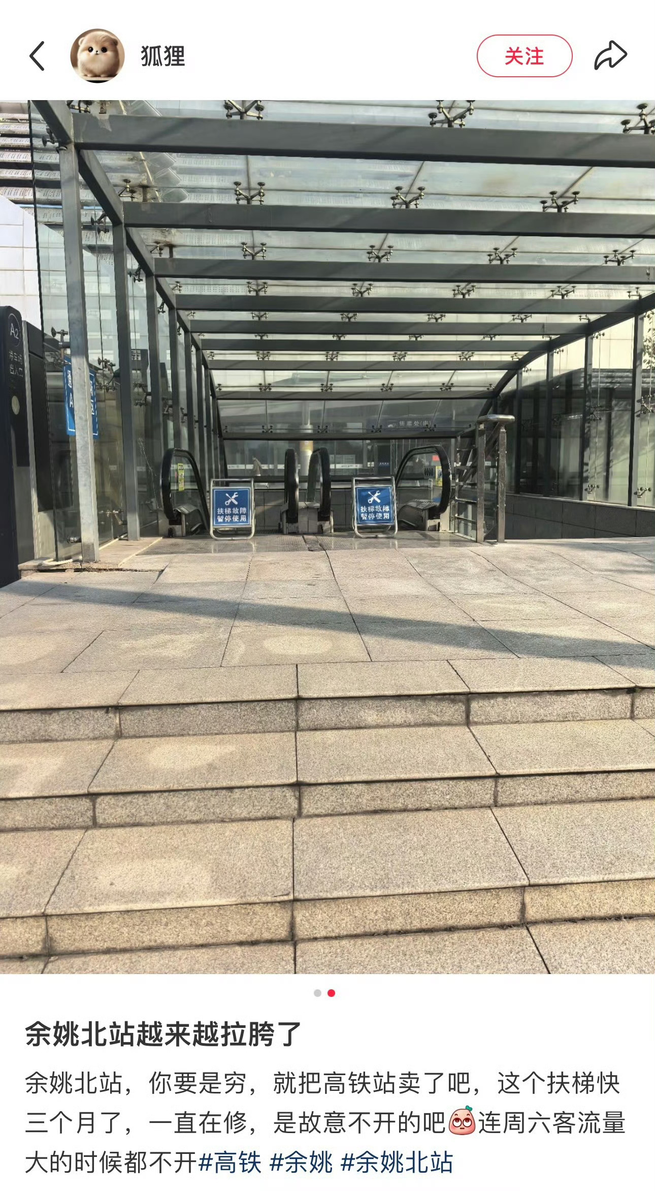 网友“狐狸”发帖吐槽:余姚北站,你要是穷,就把高铁站卖了吧,这个扶梯快三个月了,