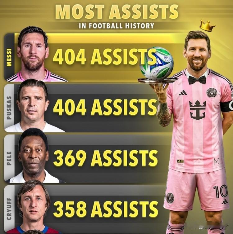 万万没想到,梅西404次助攻竟然还不是足坛最多的! 本以为梅西是足坛唯一一位职业生涯总助攻数破400的球员,万万没想到强中更有强中手,梅西的404次助攻仅仅只是追平了上古神兽普斯卡什的助攻记录,不得不说梅西还得继续努力呀。 球王贝利职业生涯同样送出了369次助攻,真的是太意外了,不仅能进球,助攻也是顶级水准,本以为梅西是足坛唯一进球+助攻都是顶级的巨星,没想到普斯卡什和贝利竟然都不输梅西。 而且懂球的都知道,以前的足坛助攻得到要求比较难,必须是最后一次触球进球才算助攻,不像现在只要把球传出去了就算助攻,因此梅西助攻的含金量要比普斯卡什的低得多。