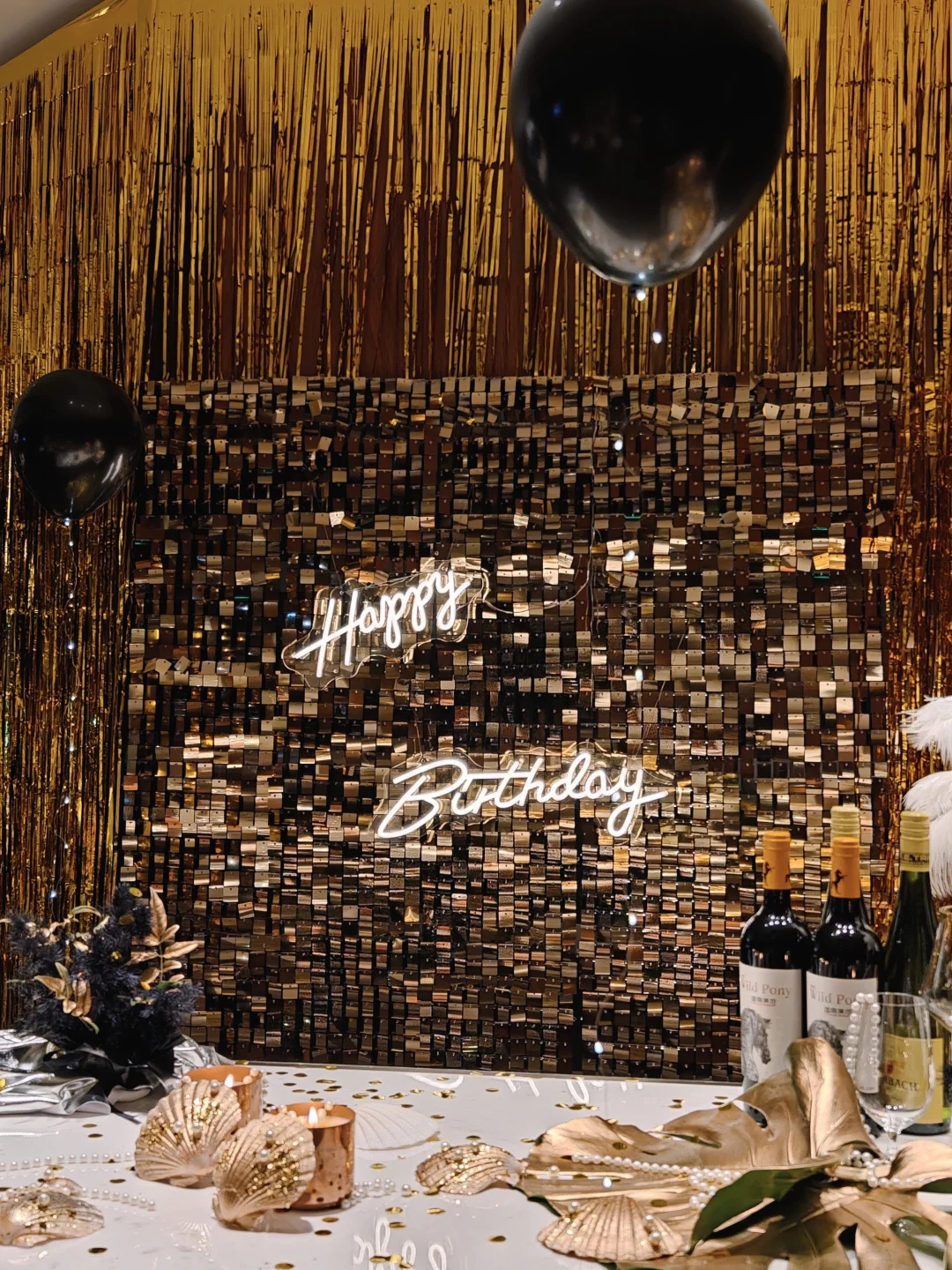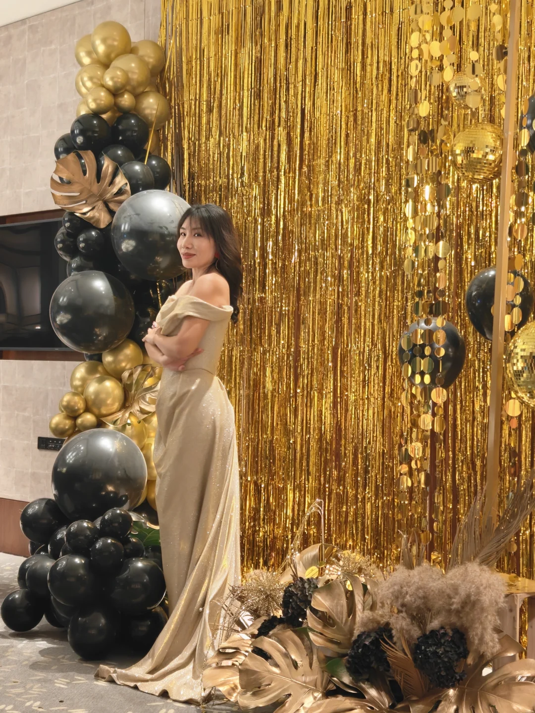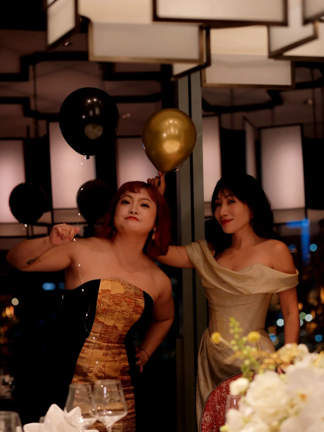 超大落地窗直对钱塘江,包厢可以做各种派对装饰,这次我们选择了黑金风,简单的金属丝带和气球布置后,拍照根本不用修图📸
