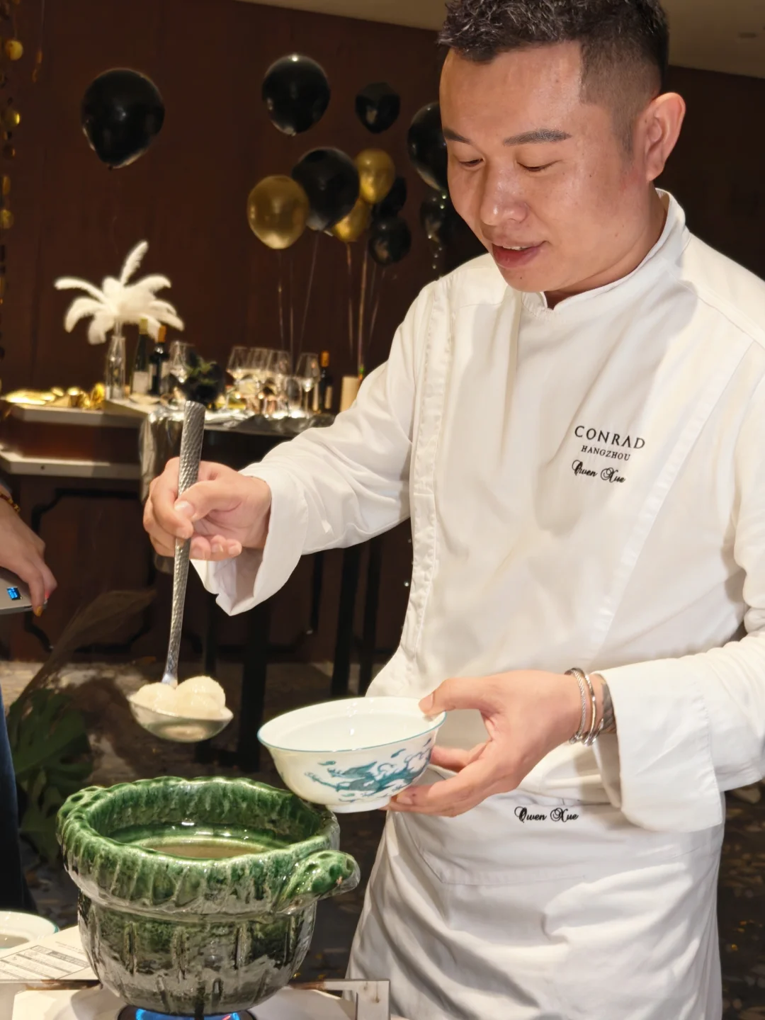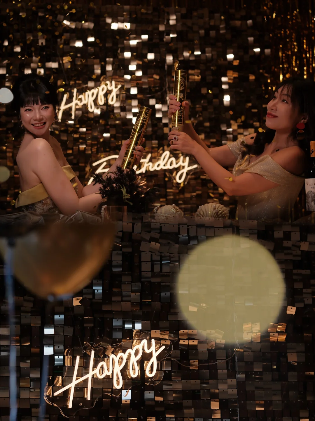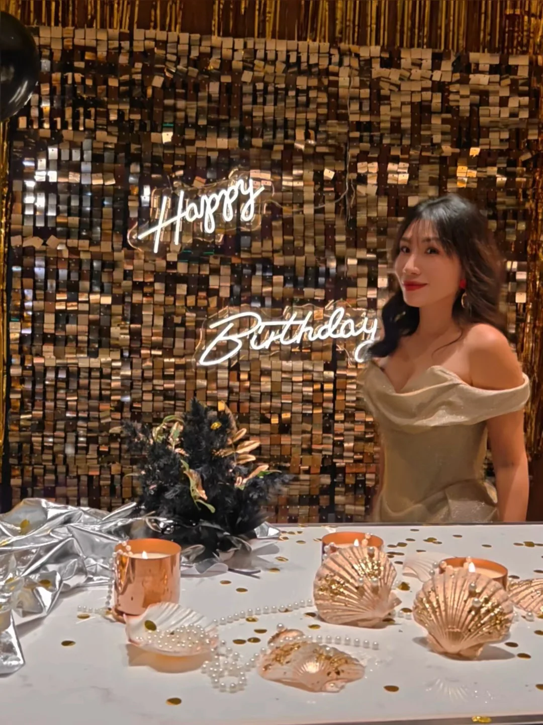 超大落地窗直对钱塘江,包厢可以做各种派对装饰,这次我们选择了黑金风,简单的金属丝带和气球布置后,拍照根本不用修图📸
