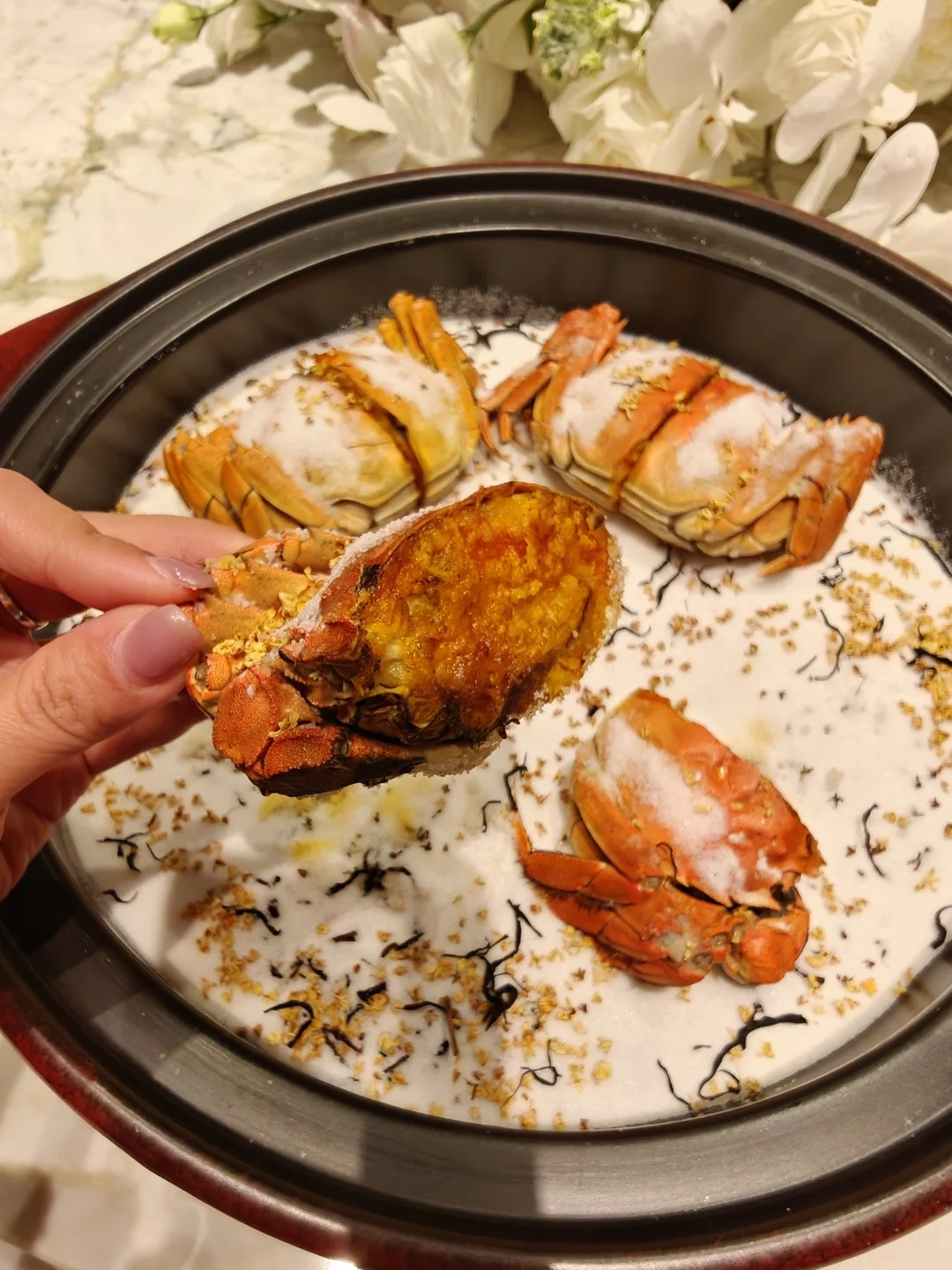 🦀九曲红梅盐焗大闸蟹:太有创意了!茶香中和了蟹的腥,肉质饱满满是蟹黄,蟹味超浓郁。